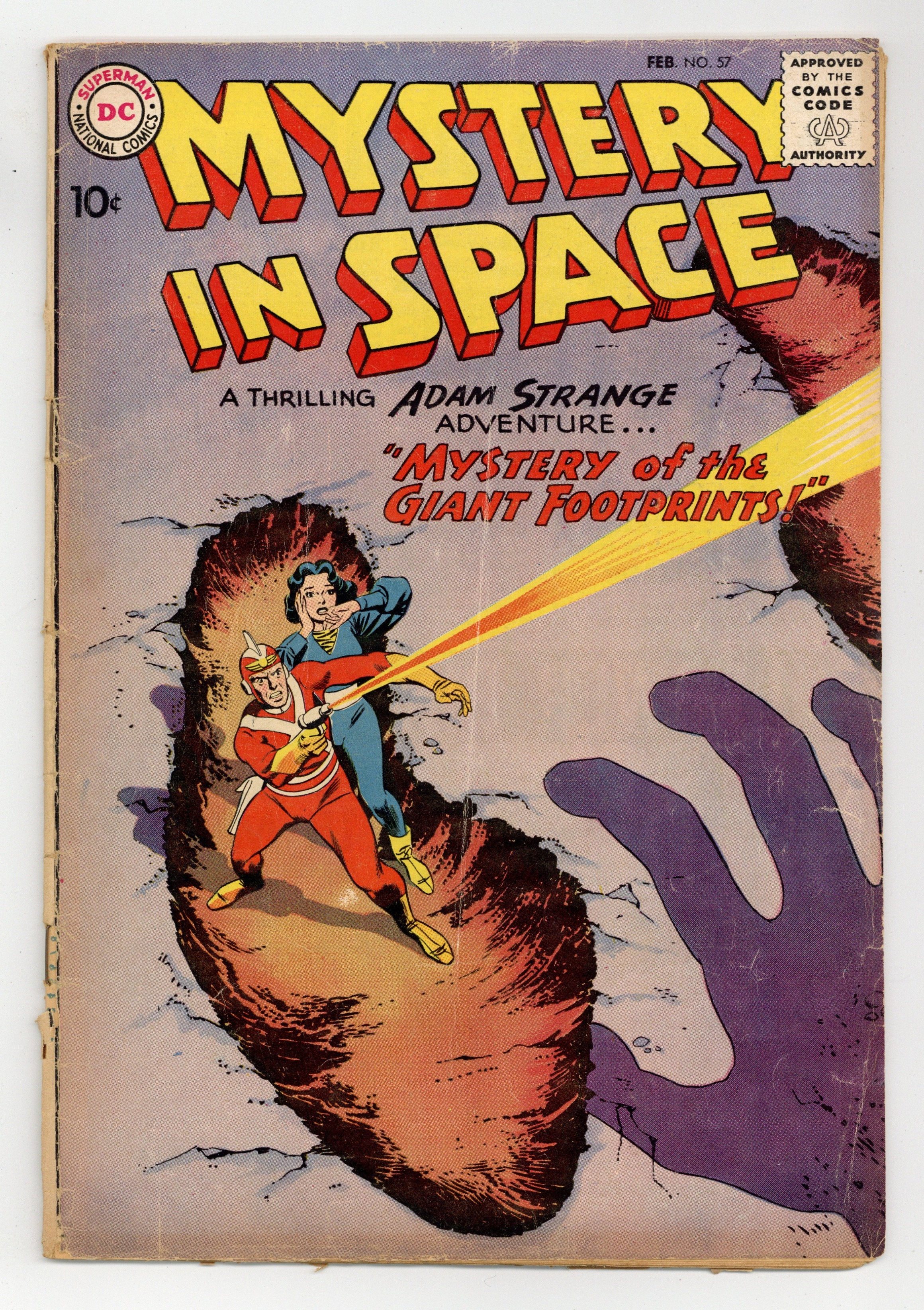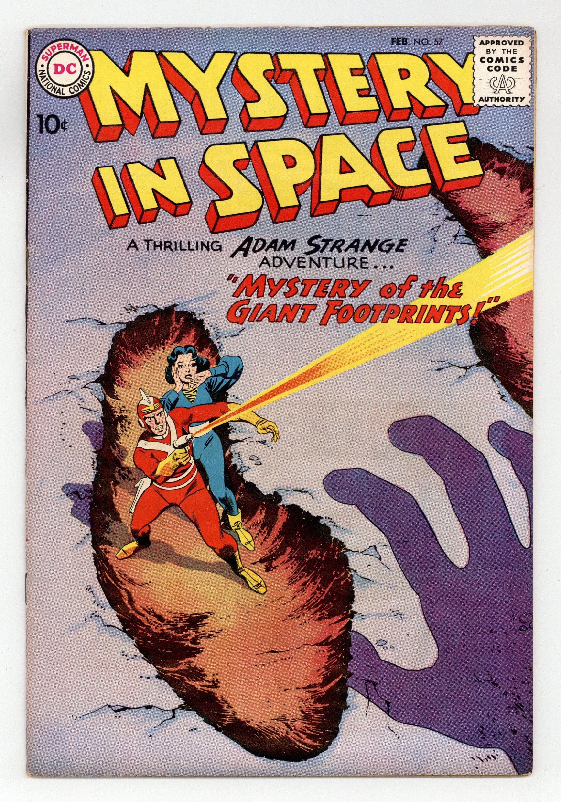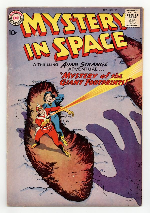 Adam Strange stars in "Mystery of the Giant Footprints" (pencils by Carmine Infantino). Back-up stories: "The Living Statues of Venus" and "Secret of the Strange Satellite!" (art by Murphy Anderson). Gil Kane cover pencils. 36 Pages, Full Color. Cover price $0.10.