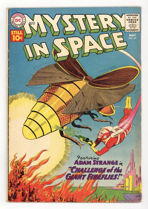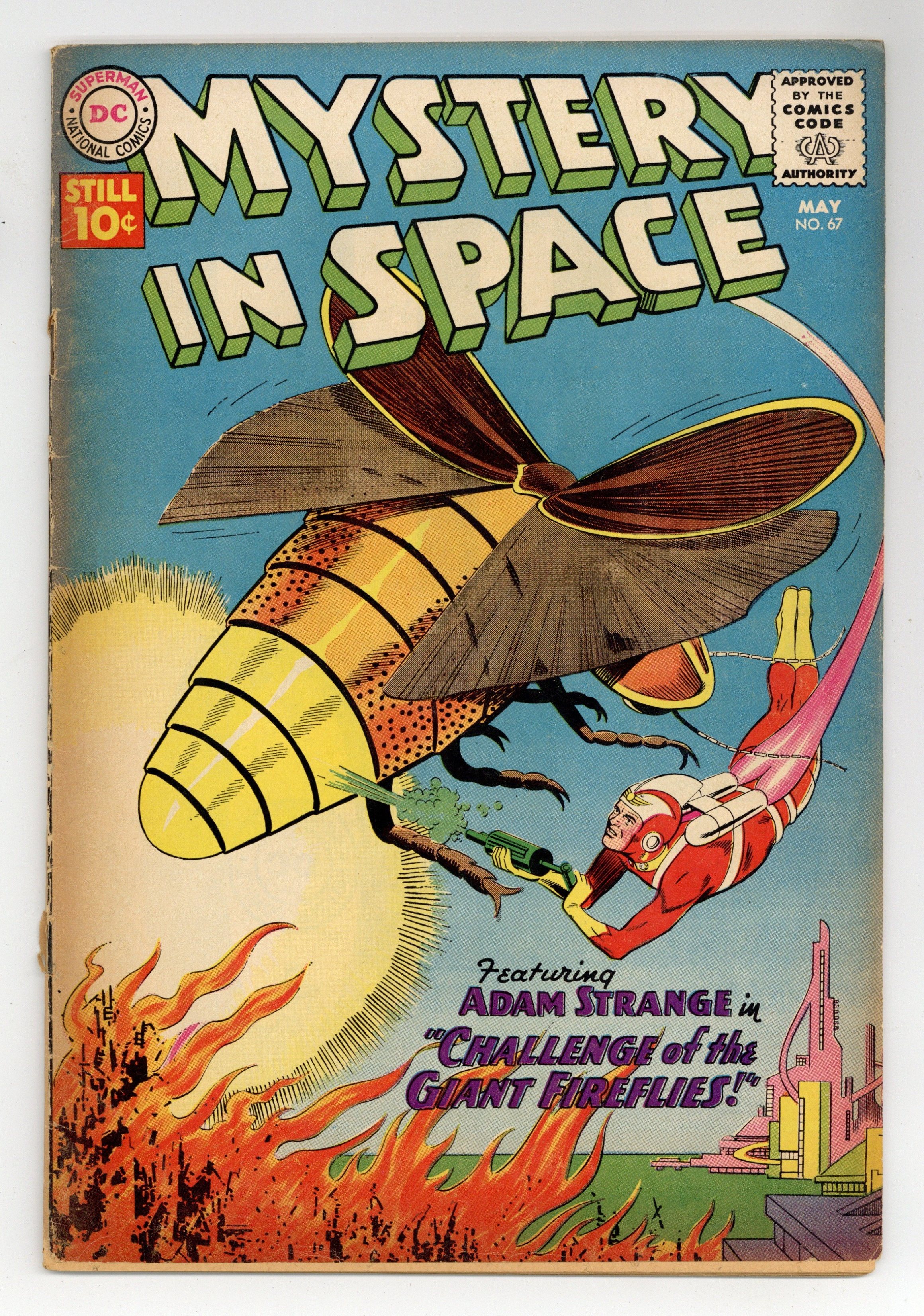 Adam Strange stars in "Challenge of the Giant Fireflies!" (pencils by Carmine Infantino). Back-up stories: "Language-Master of Space!" (art by Sid Greene?) and "Mystery Message from Fort Nova!" (pencils by Gil Kane). Infantino cover pencils. 36 Pages, Full Color. Cover price $0.10.