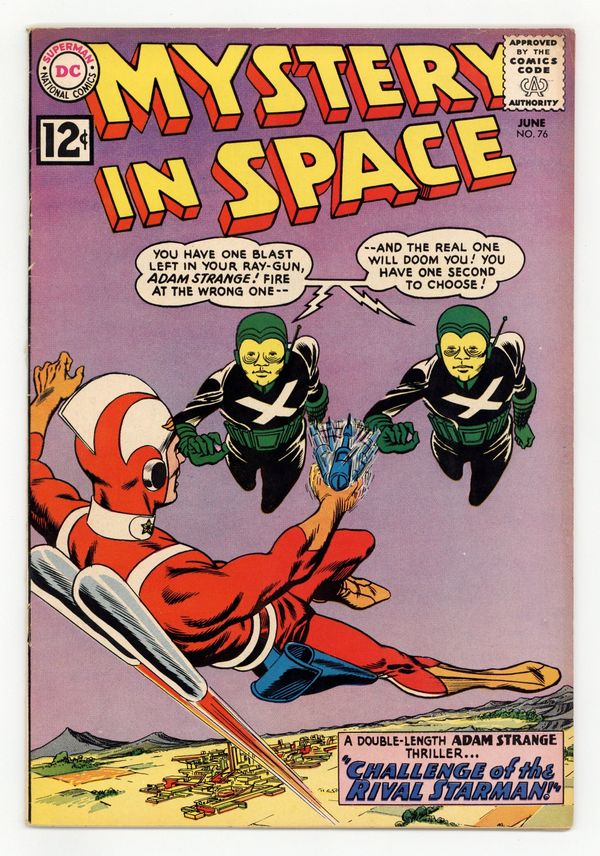 Adam Strange stars in "Challenge of the Rival Starman!" Script by Gardner Fox, pencils by Carmine Infantino, inks by Murphy Anderson. Backup story: "The Trojan Whale of Space!" (art by Sid Greene?). Letter to the editor from early comics fan Paul Gambaccini. Infantino cover. 36 Pages, Full Color. Cover price $0.12.