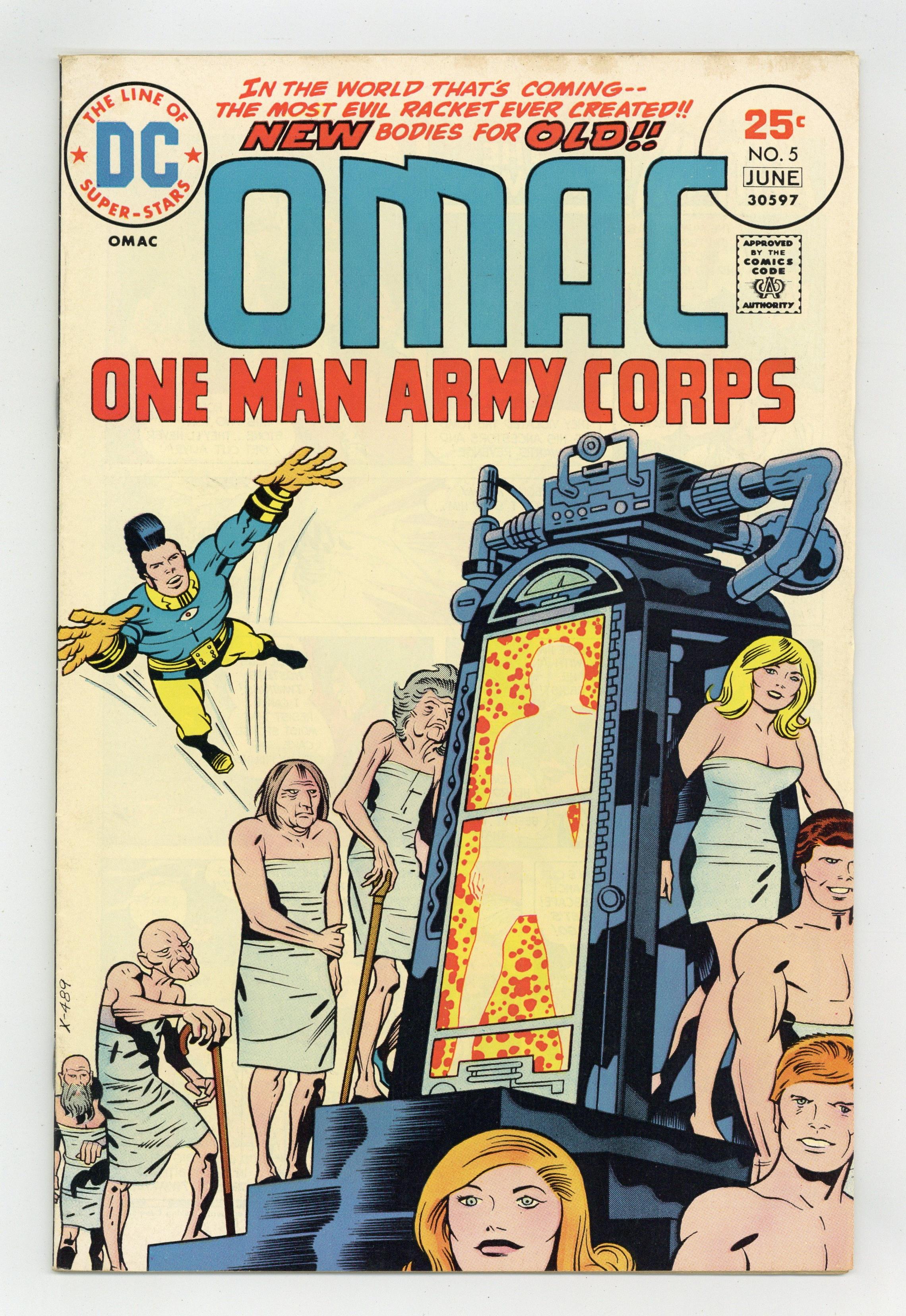 $7.30"New Bodies for Old." The Crime Cabal's brain transplant scheme is attacked by Omac and reluctant ally Buck Blue. Script and pencils by Jack Kirby, inks by D. Bruce Berry. Cover by Kirby and Berry. Cover price $0.25.