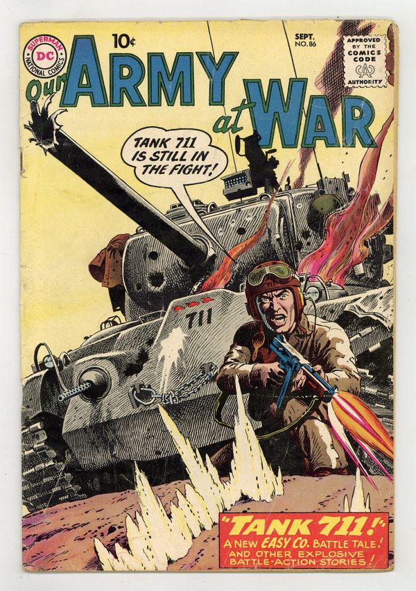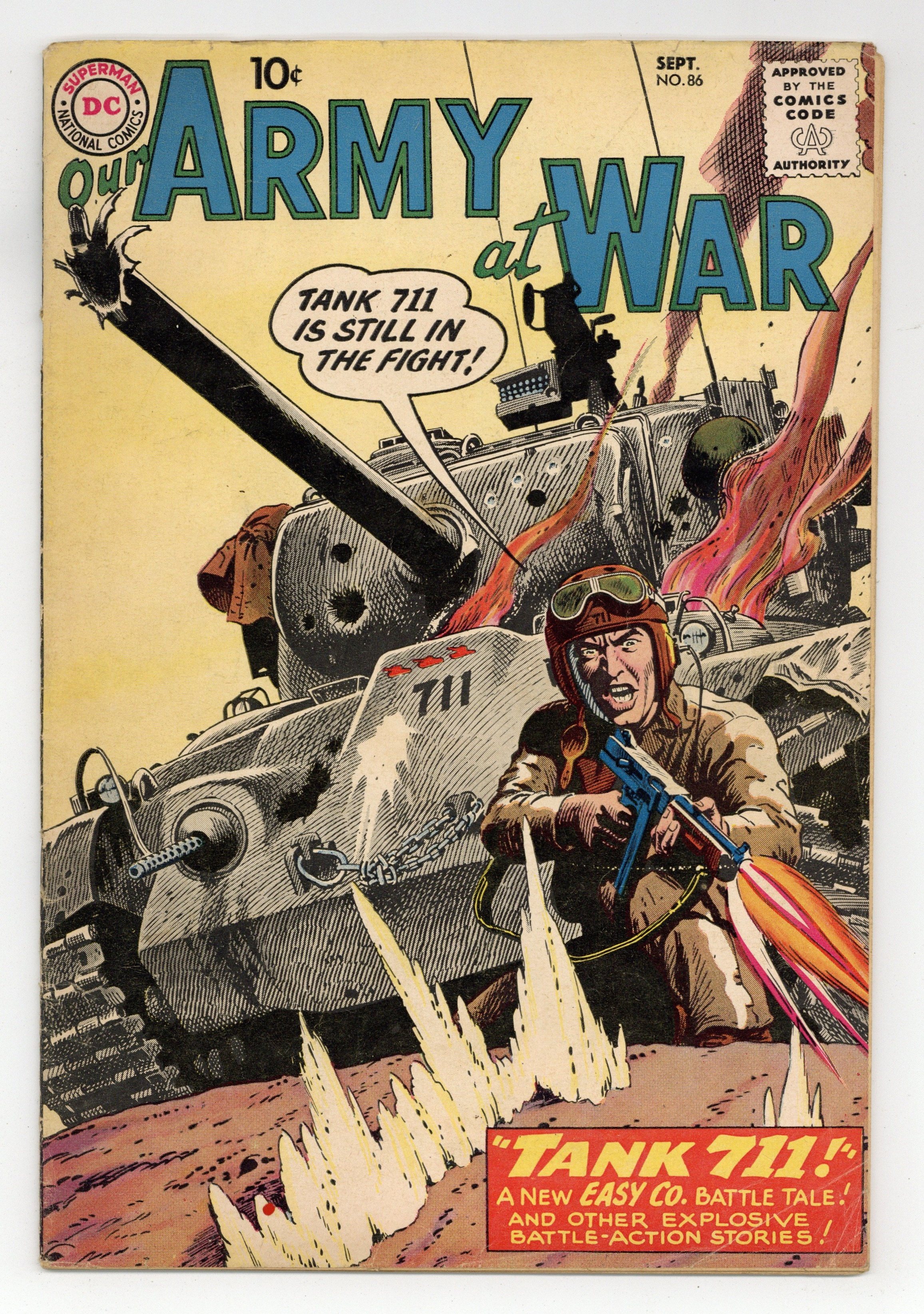 Cover art by Russ Heath. Tank 711 starring Sgt. Rock, script by Bob Haney, art by Joe Kubert. Palisades Park ad with Superman. Last Ride for a Mustang, script by Bob Haney, art by Russ Heath. Bring Up the Bazooka, script by Hank Chapman, art by Jack Abel. 36 Pages, Full Color. Cover price $0.10.