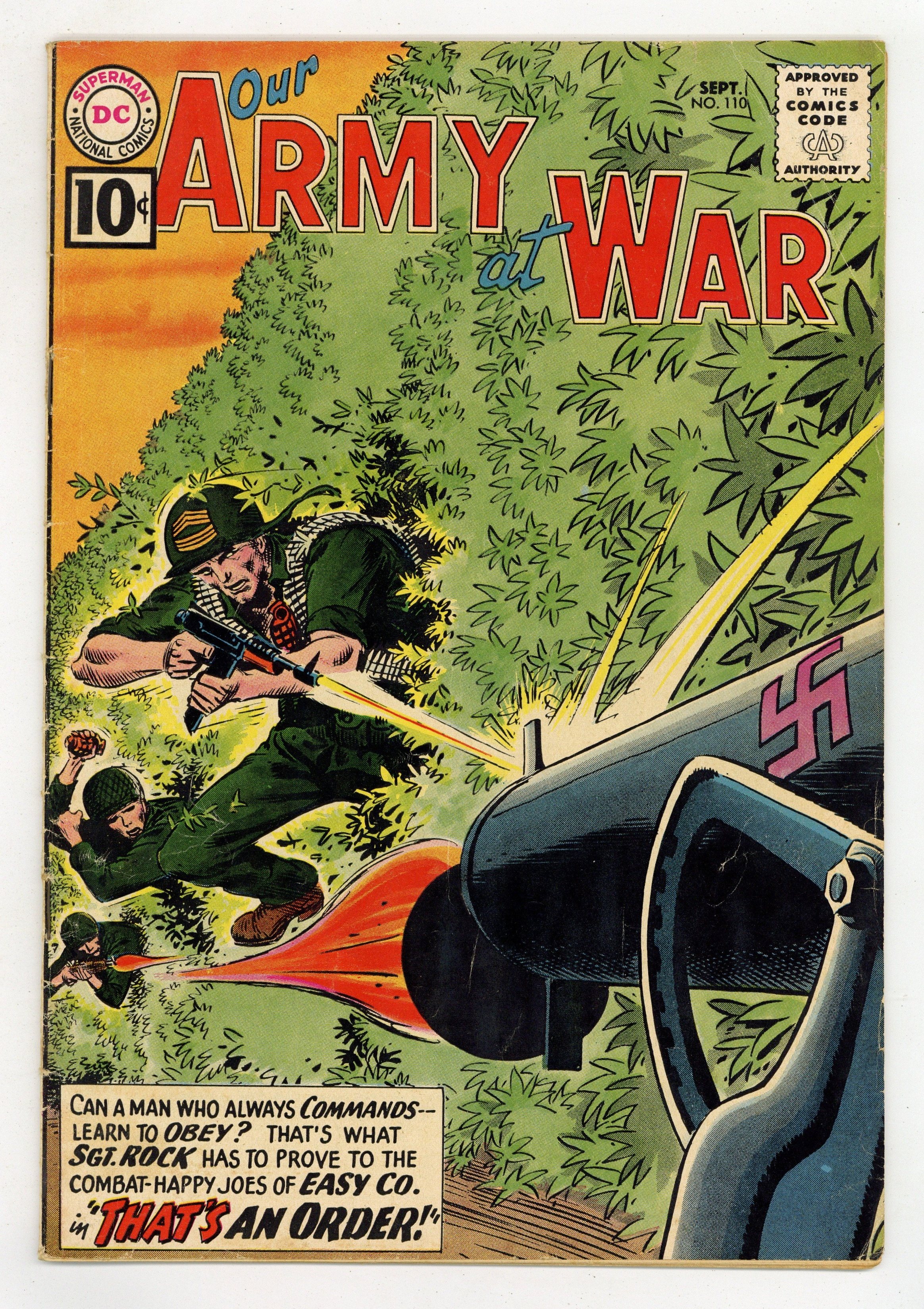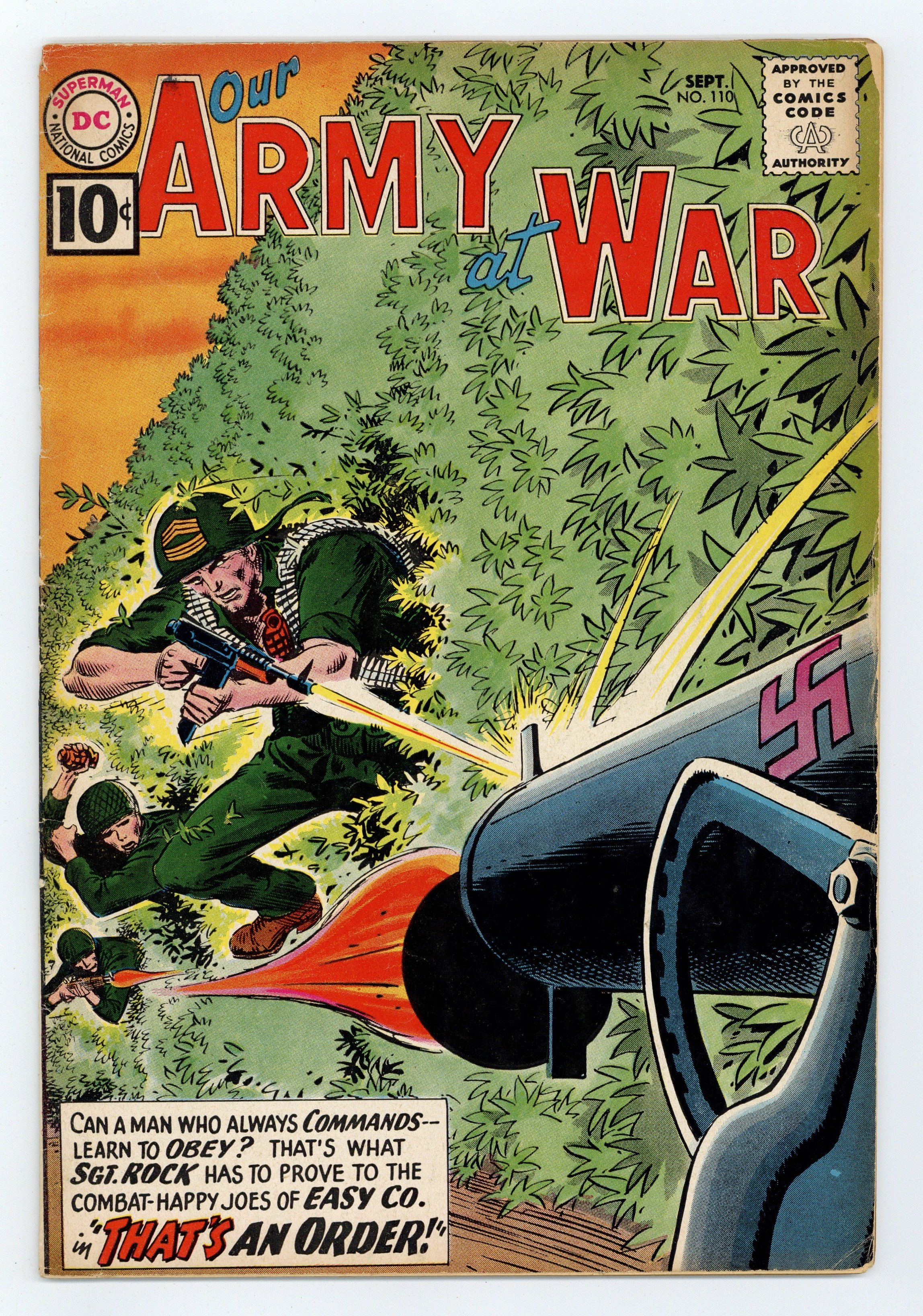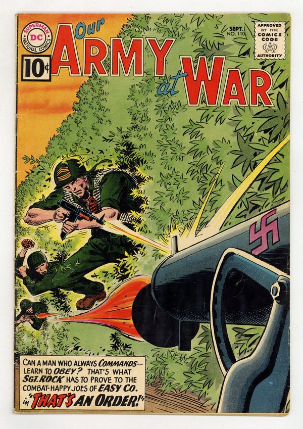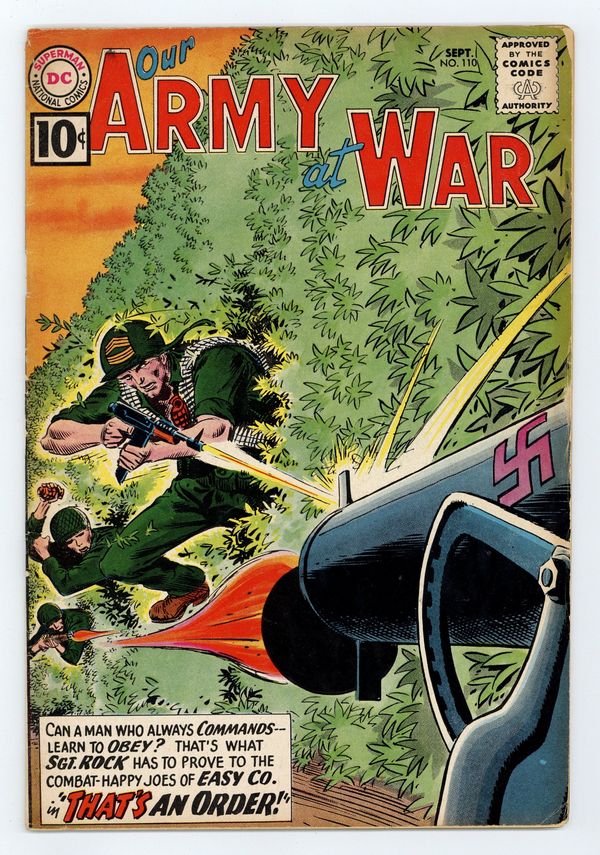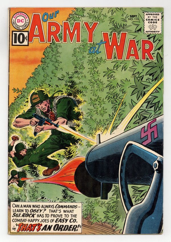 $47.50Cover art by Jerry Grandenetti. That's An Order starring Sgt Rock, script by Bob Kanigher, art by Joe Kubert. Return of the Ghost Bomber, script by Bob Haney, art by Jack Abel. 36 Pages, Full Color. Cover price $0.10.