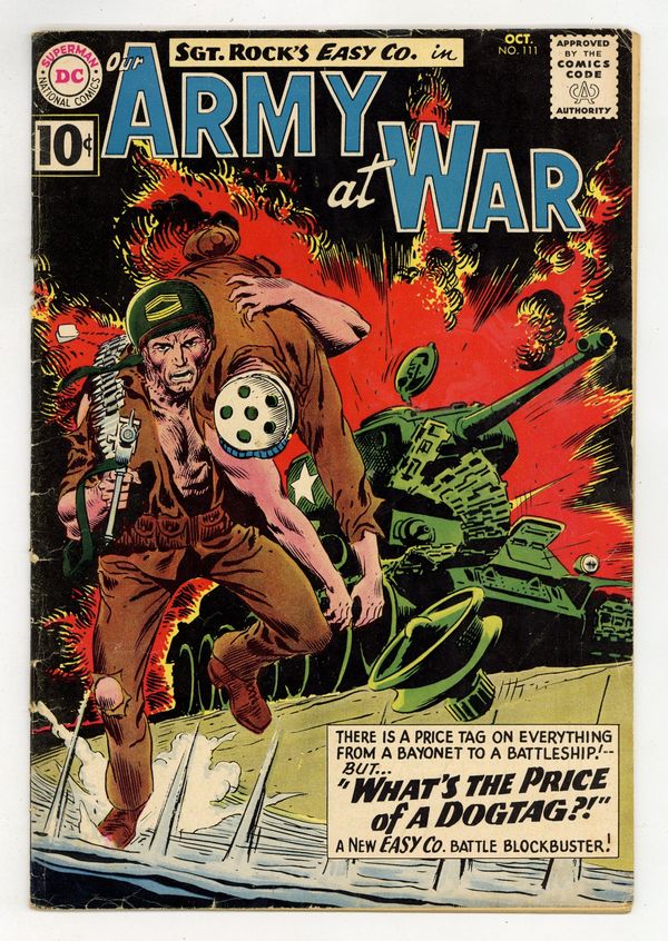 Cover by Joe Kubert. Stories by Robert Kanigher and Hank Chapman. Art by Joe Kubert and Ross Andru. There is a price tag on everything from a bayonet to a battleship! But..."What's the Price of a Dogtag?" Don't miss this Sgt. Rock and Easy Co. battle blockbuster by Robert Kanigher and Joe Kubert. Also in this issue: "Bring Back the Enemy's Flag!" by Hank Chapman and Ross Andru; "Butterfingered Bombardier!" by Hank Chapman and Joe Kubert; and half-pager "Walkie-Talkie" (by unknown). 32 pages, full color. Cover price $0.10.
