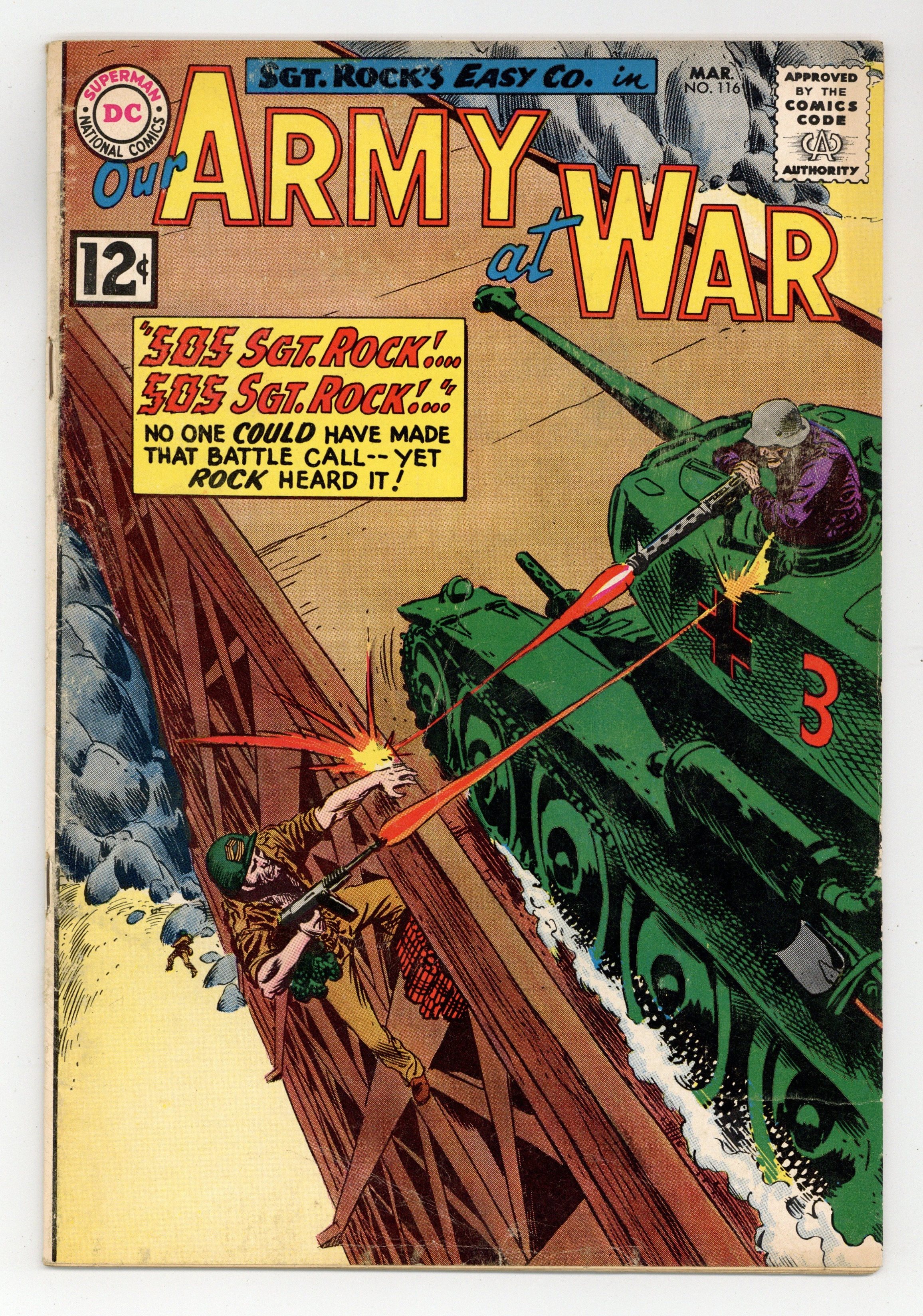Cover art by Joe Kubert. SOS Sgt. Rock, script by Bob Kanigher, art by Joe Kubert. One Must Get There, script by Hank Chapman, art by Jack Abel. The Tank Was a Lemon, script by Hank Chapman, pencils by Ross Andru, inks by Mike Esposito. 36 Pages, Full Color. Cover price $0.12.