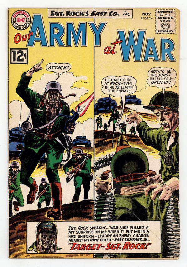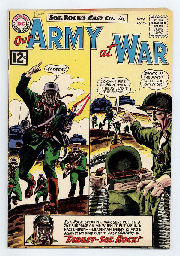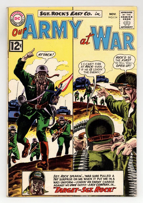 Cover art by Joe Kubert. Target--Sgt. Rock starring Sgt. Rock, script by Bob Kanigher, art by Joe Kubert. Flattop Tank, script by Hank Chapman, art by Irv Novick. 36 Pages, Full Color. Cover price $0.12.