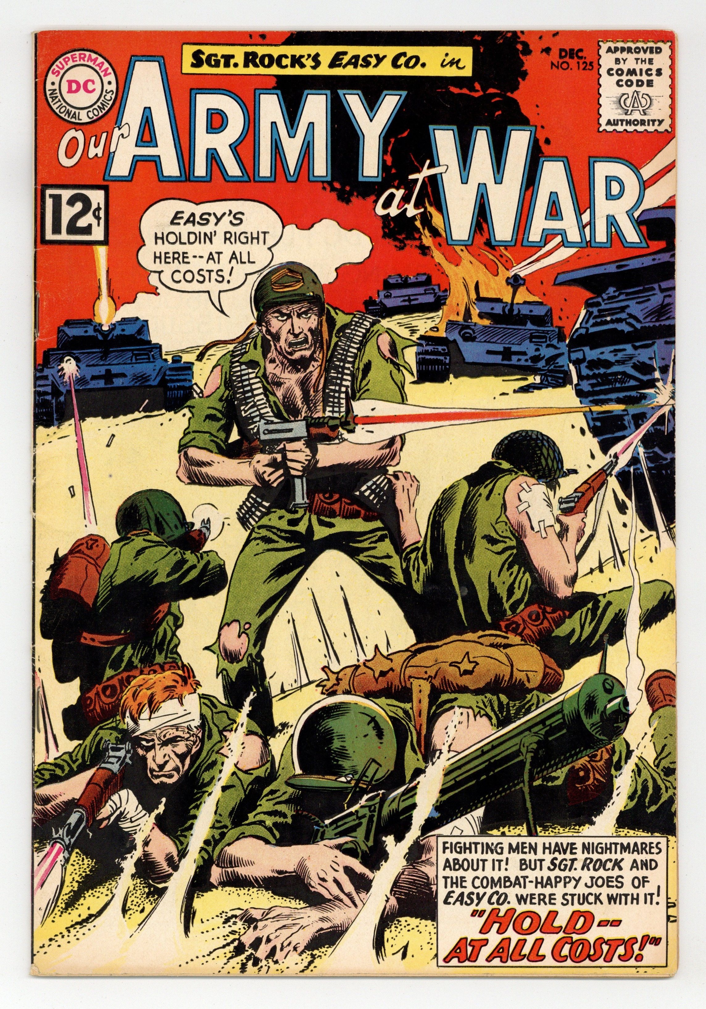 $24.00Cover art by Joe Kubert. Hold--At All Costs starring Sgt. Rock, script by Bob Kanigher, art by Russ Heath. Wings of Shame, script by Hank Chapman, art by Jack Abel. The Bug That Won An Island, script by Bob Haney, pencils by Ross Andru, inks by Mike Esposito. 36 Pages, Full Color. Cover price $0.12.