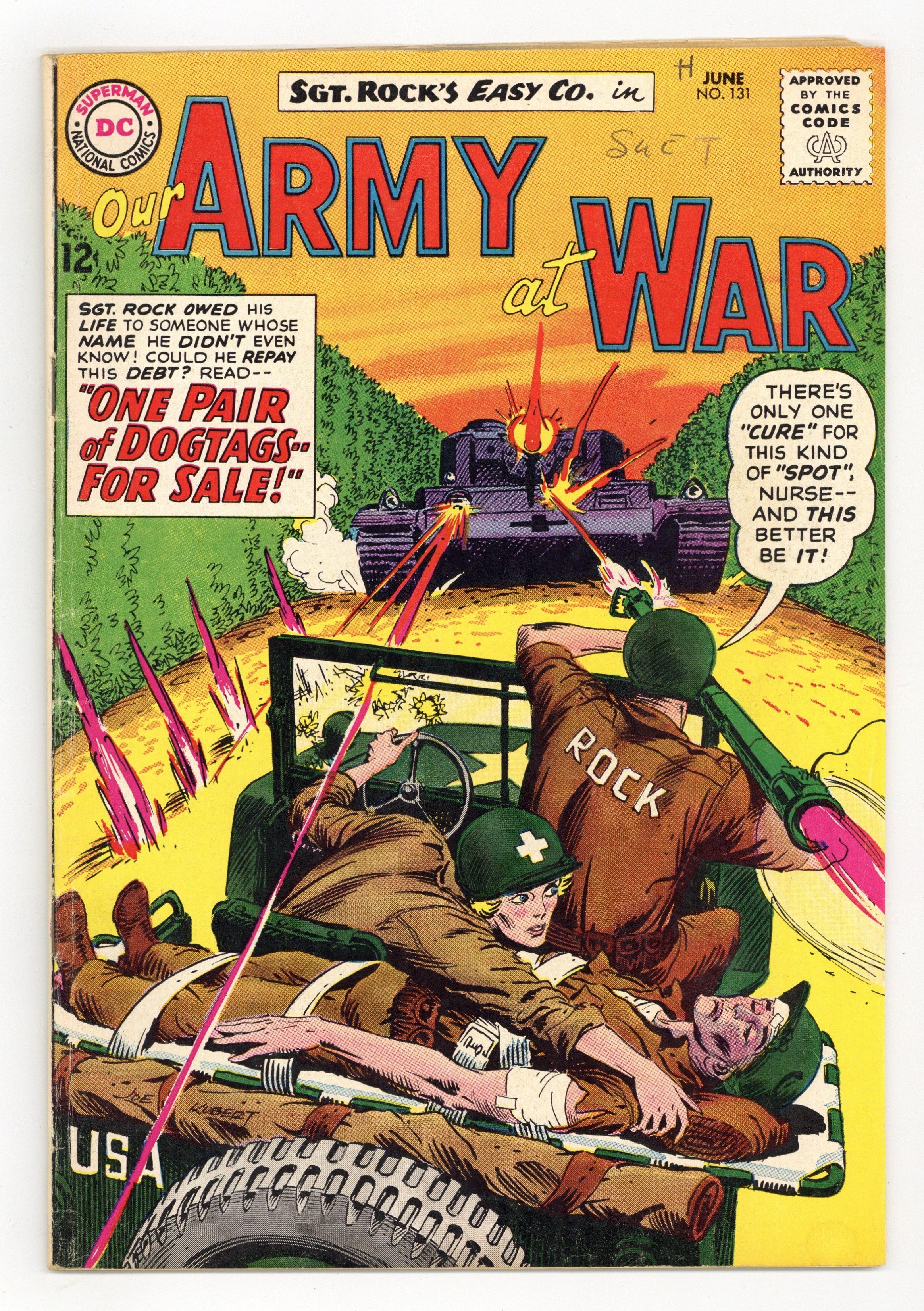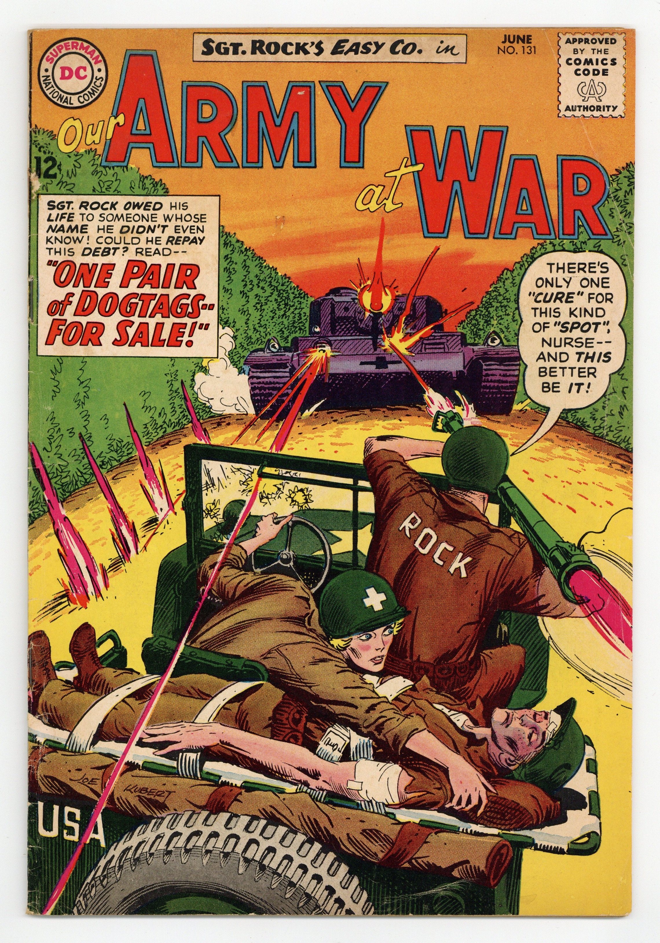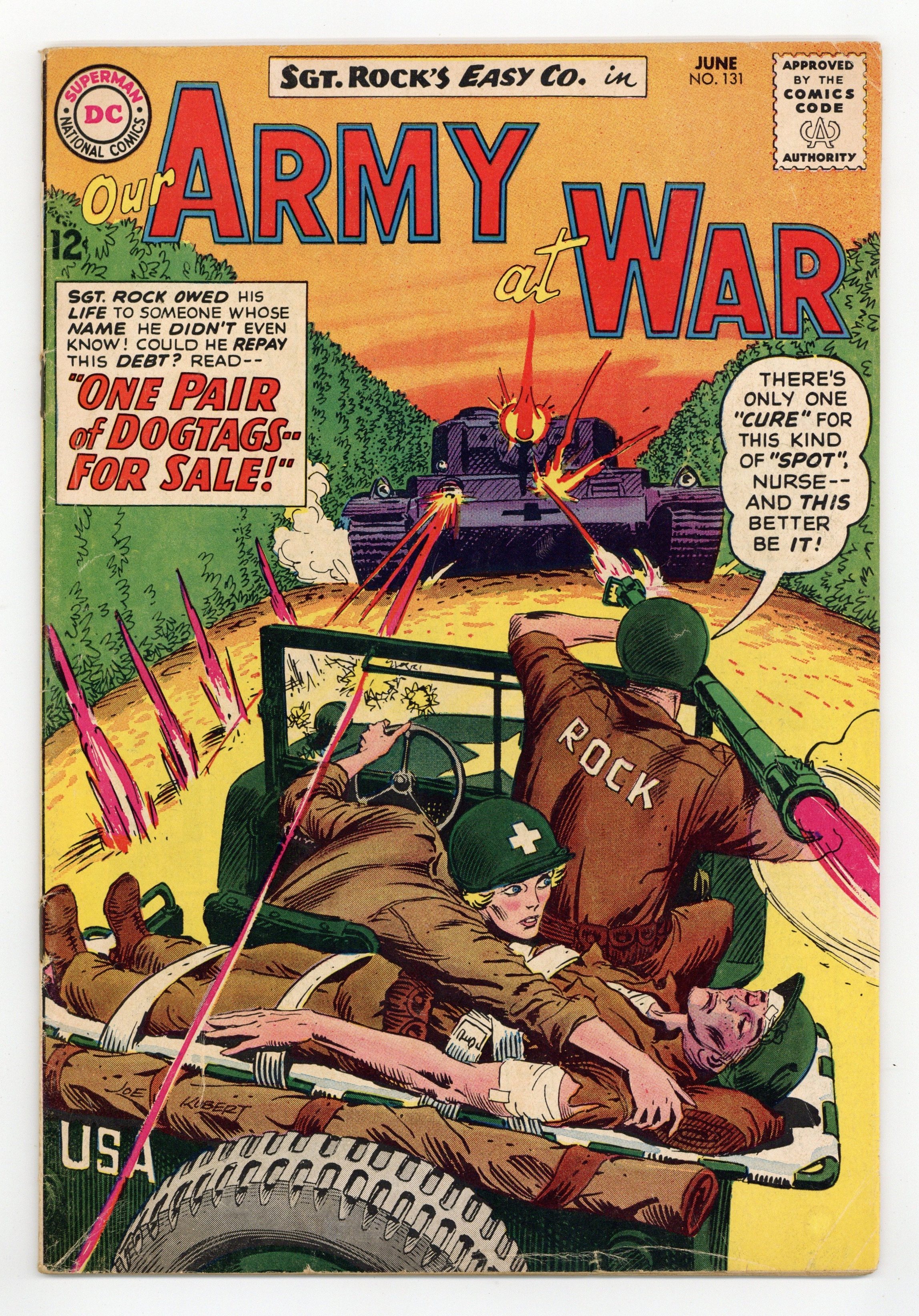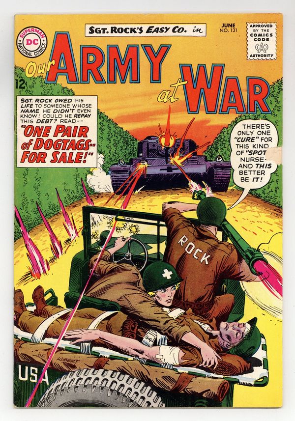 Cover art by Joe Kubert. One Pair of Dogtags -- For Sale starring Sgt. Rock, script by Bob Kanigher, art by Joe Kubert. Desert Hotfoot, script by Bob Haney, art by Jack Abel. Everybody Makes It In Dog Co., script by Bob Kanigher, art by Jack Abel. 36 Pages, Full Color. Cover price $0.12.