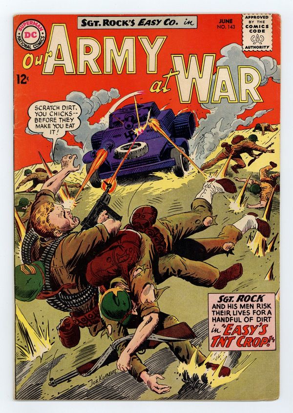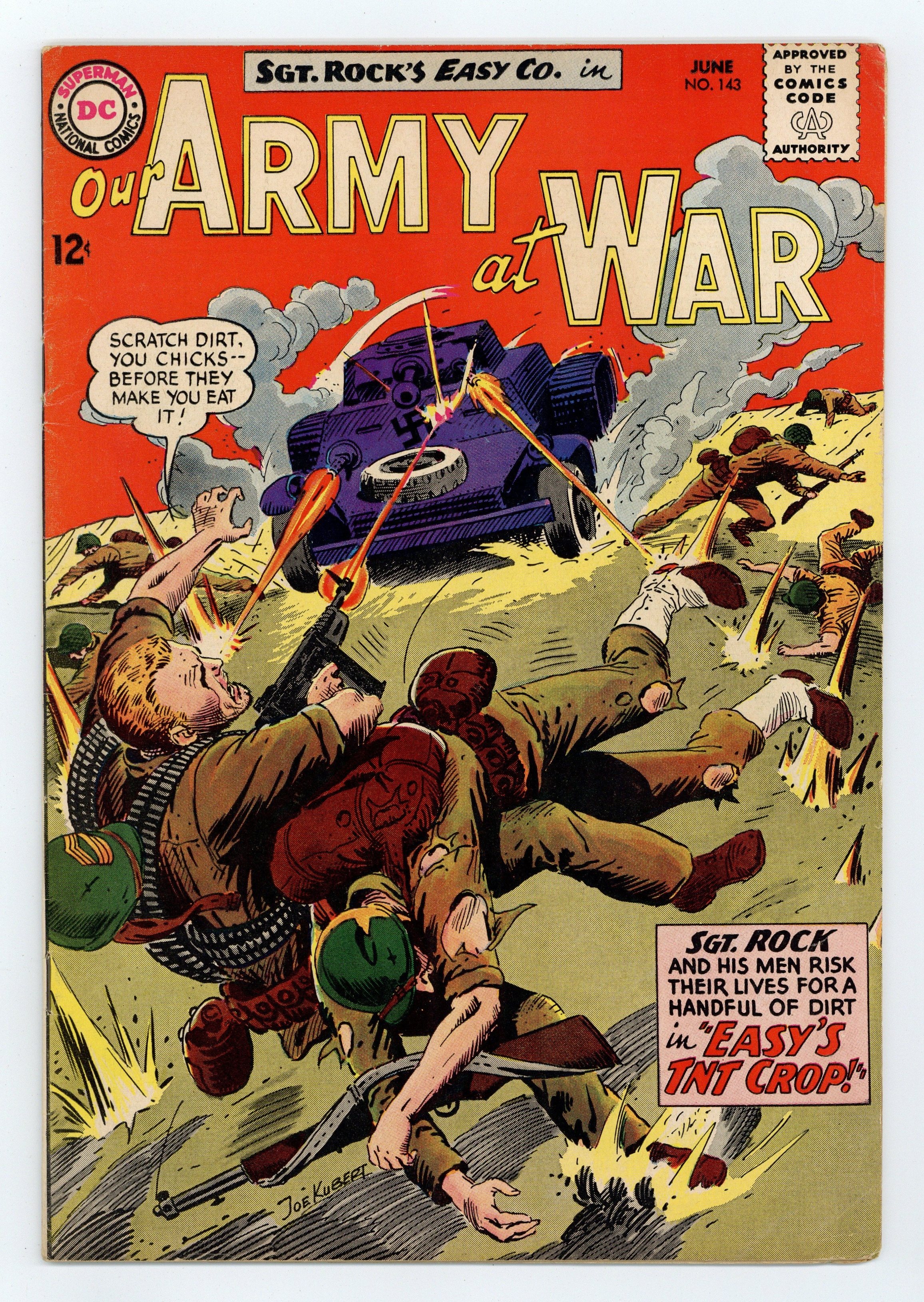 Cover art by Joe Kubert. Easy's TNT Crop starring Sgt. Rock, script by Bob Kanigher, art by Joe Kubert. Rock and company risk lives for handful of dirt. Sandbox Sub, script by Kin Platt, art by Jack Abel. 36 Pages, Full Color. Cover price $0.12.