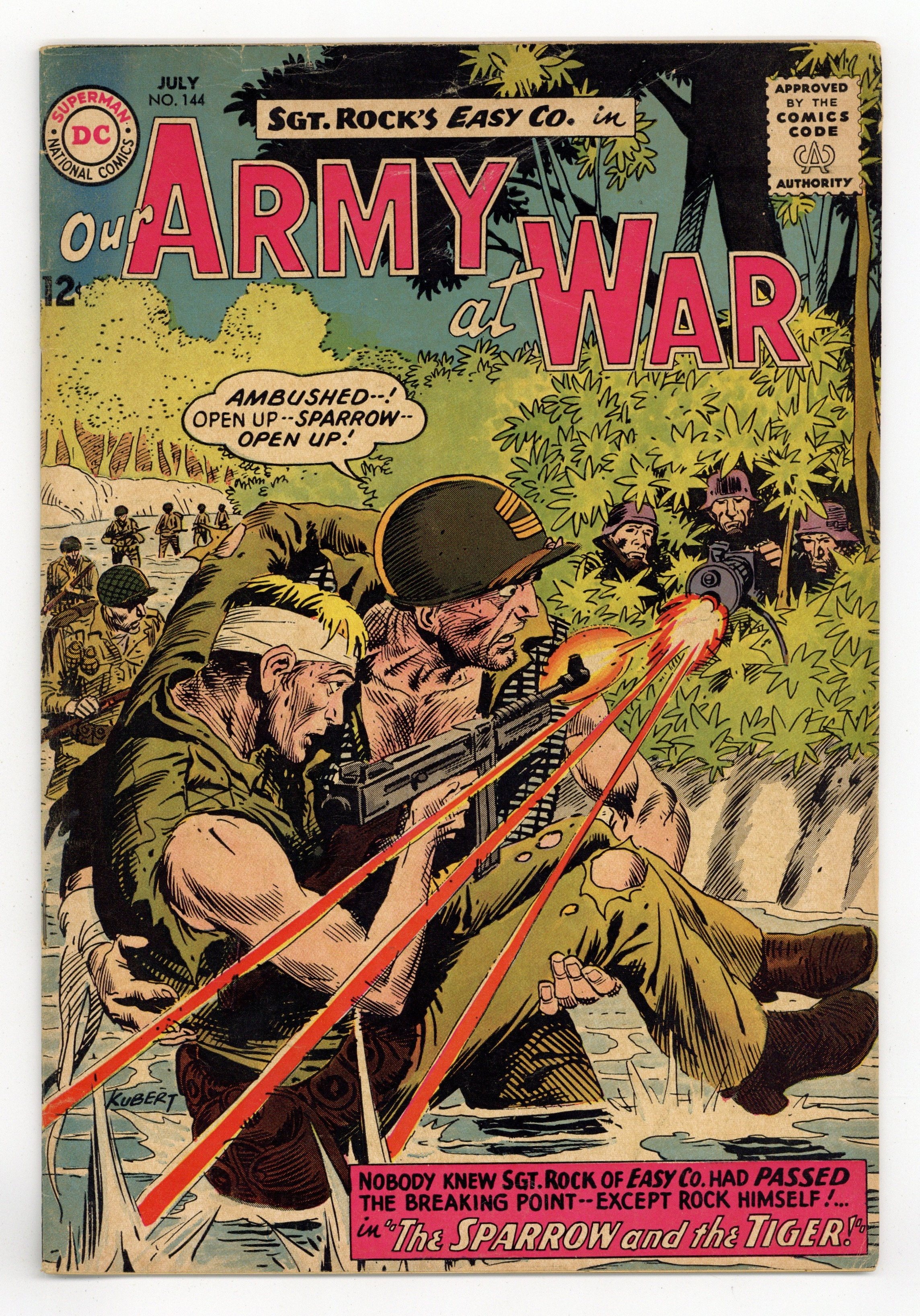 Cover art by Joe Kubert. The Sparrow and the Tiger starring Sgt. Rock, script by Bob Kanigher, art by Joe Kubert. Rock passes the breaking point. Tin-Can Tank, script by Hank Chapman, art by Gene Colan. 36 Pages, Full Color. Cover price $0.12.