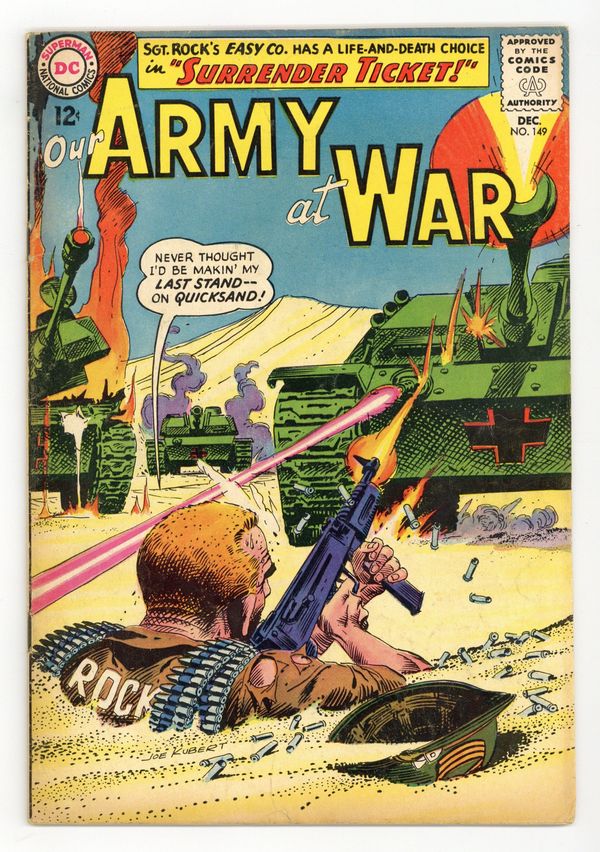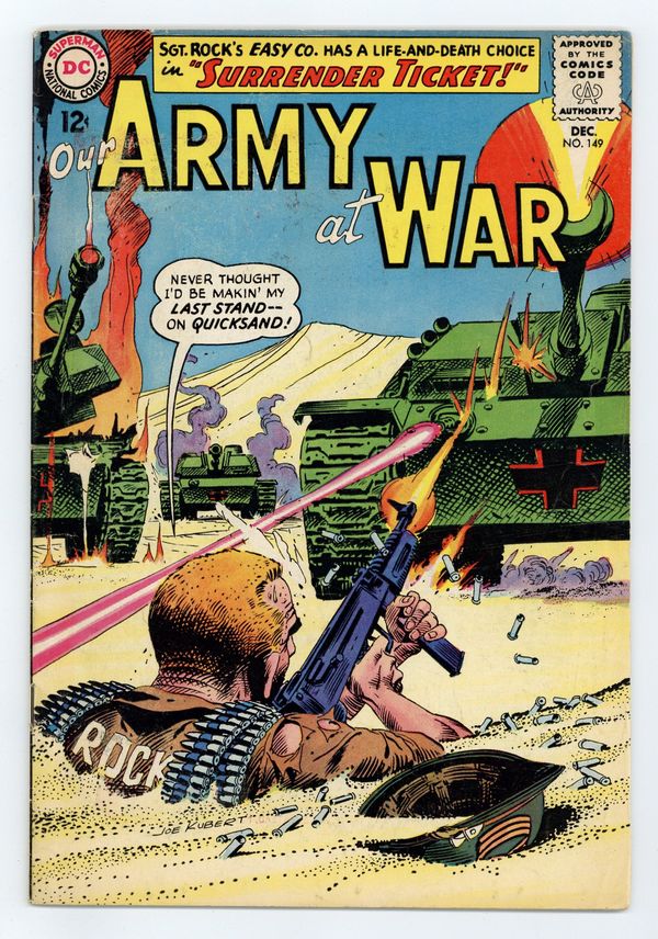 Cover art by Joe Kubert. Surrender Ticket starring Sgt. Rock, script by Robert Kanigher, art by Joe Kubert. Rock faces life and death choice. Jackass Patrol starring Sgt Mule, script by Hank Chapman, art by Jack Abel. Private Pete humor page. 36 Pages, Full Color. Cover price $0.12.
