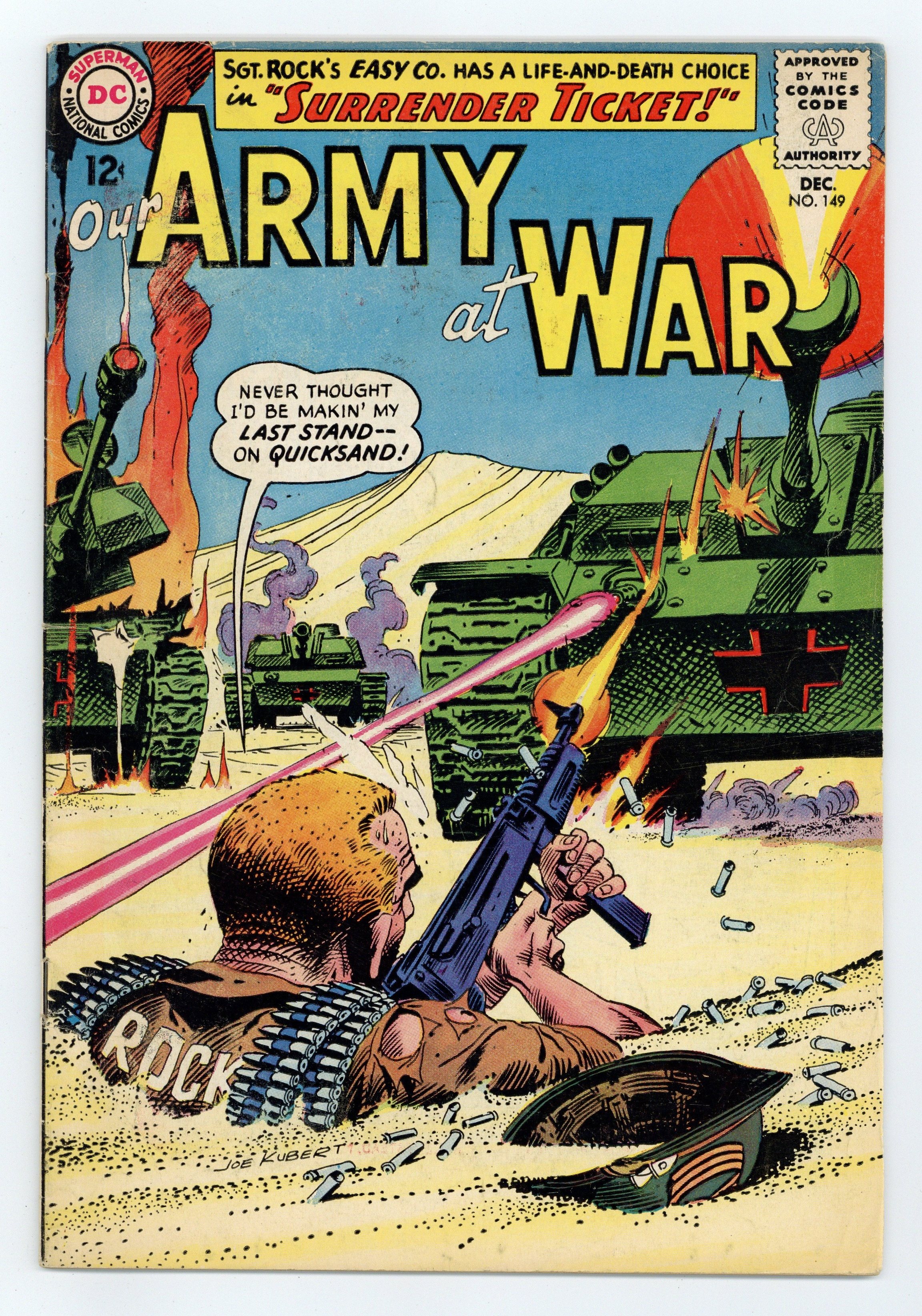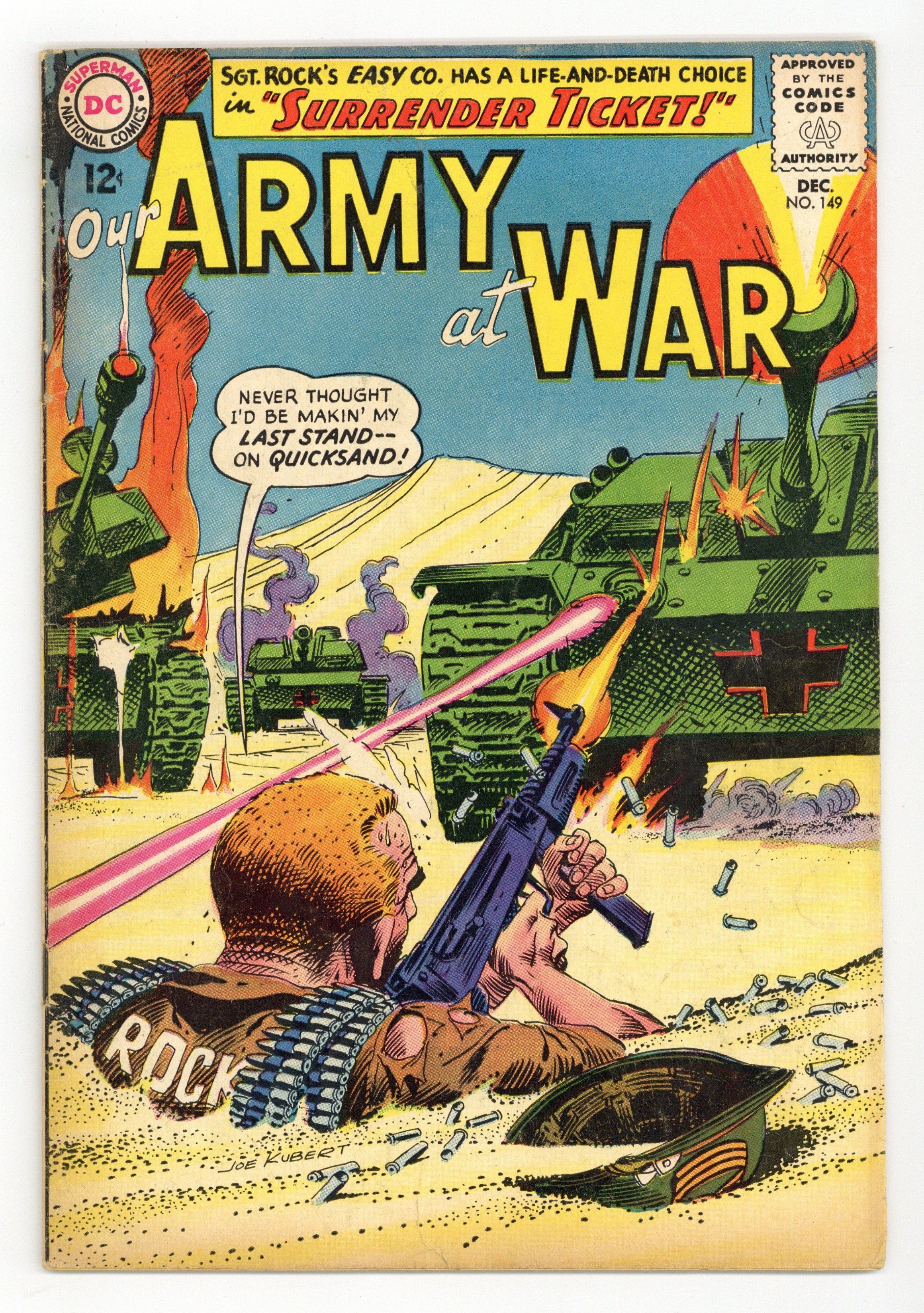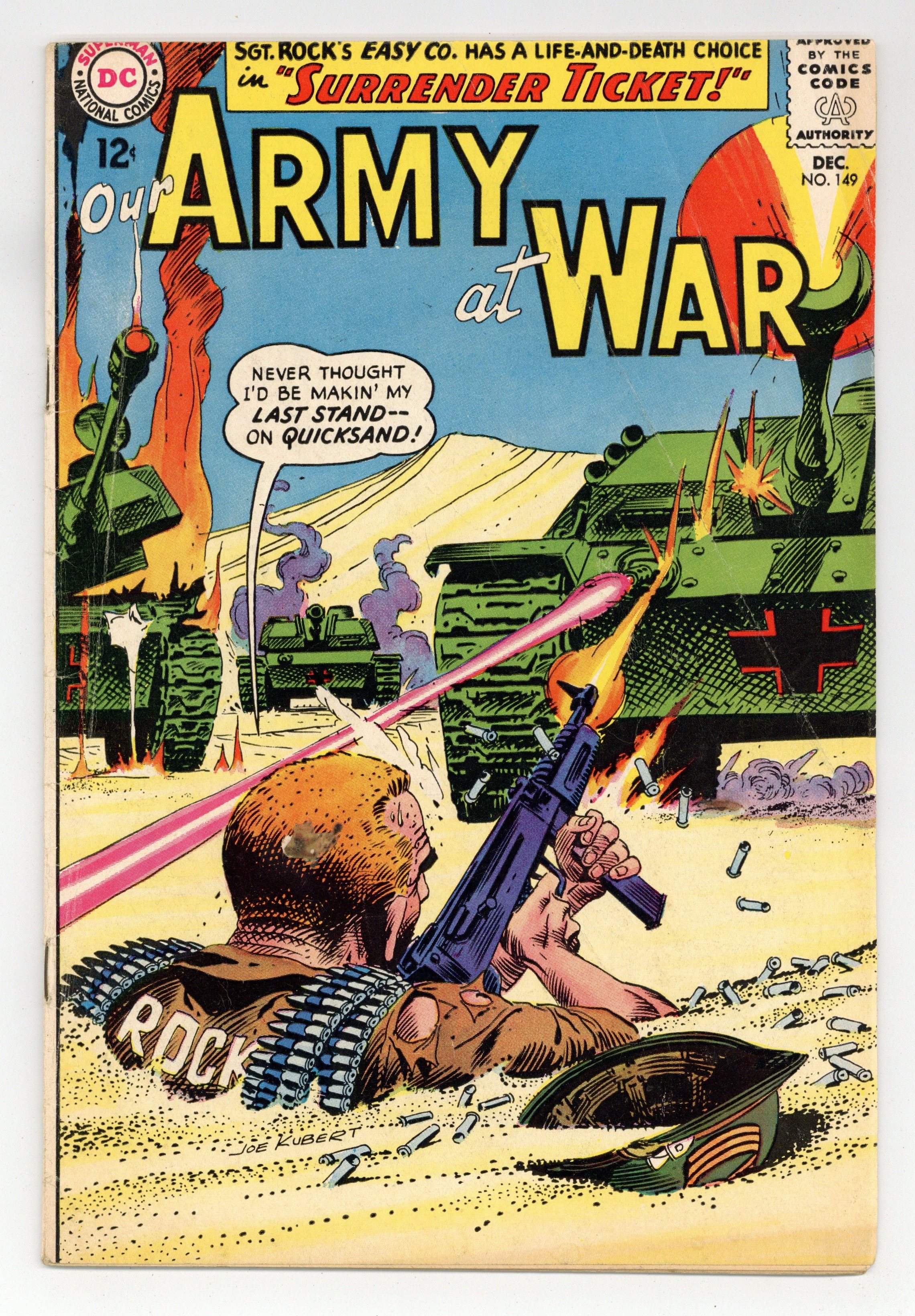 $19.50Cover art by Joe Kubert. Surrender Ticket starring Sgt. Rock, script by Robert Kanigher, art by Joe Kubert. Rock faces life and death choice. Jackass Patrol starring Sgt Mule, script by Hank Chapman, art by Jack Abel. Private Pete humor page. 36 Pages, Full Color. Cover price $0.12.