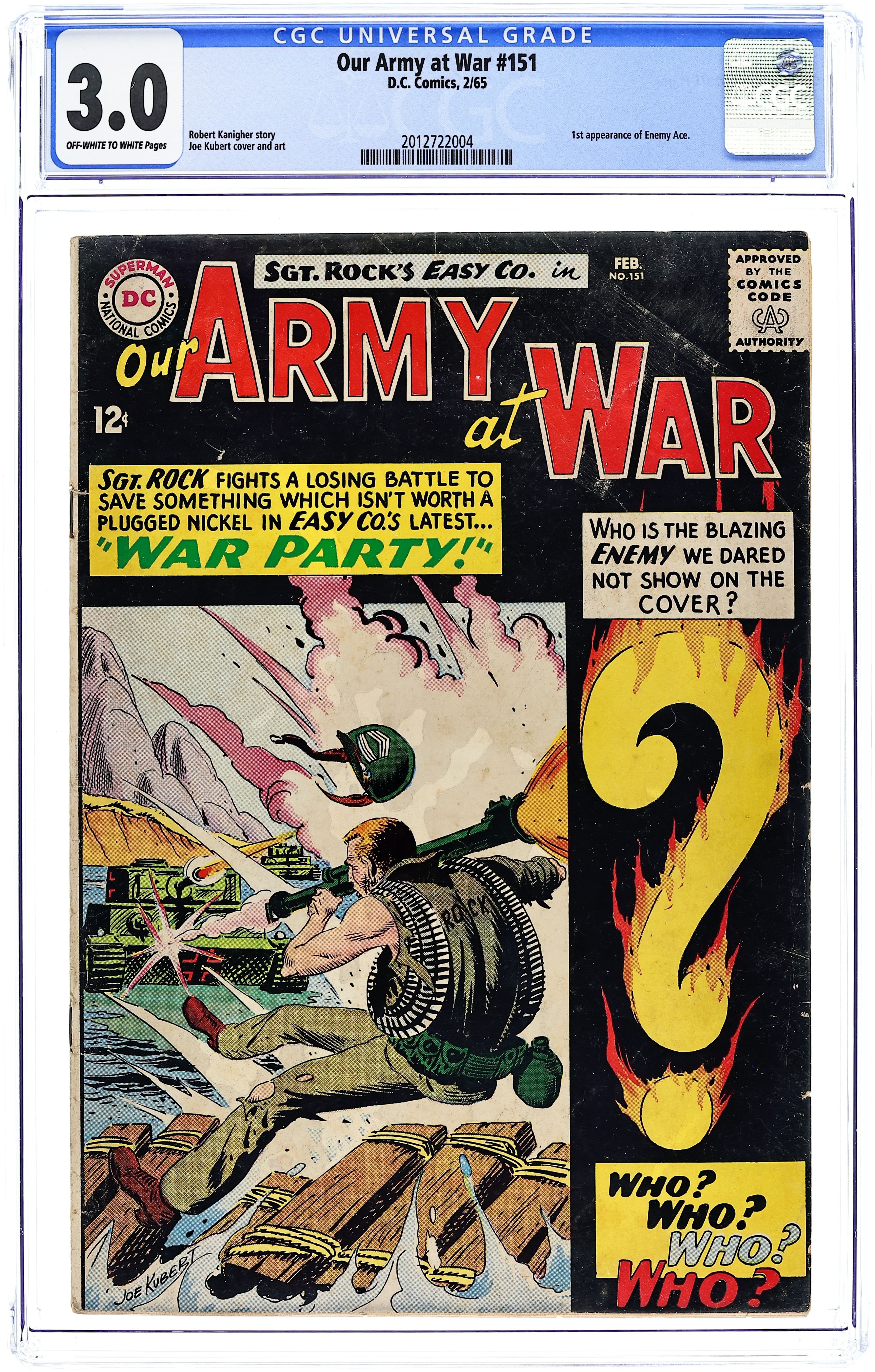 Cover art by Joe Kubert. War Party starring Sgt. Rock, script by Bob Kanigher, art by Joe Kubert. Enemy Ace, script by Bob Kanigher, art by Joe Kubert. Infantry Shields fact page, script by Julius Schwartz, pencils by Morris Waldinger, inks by Tom Nicolosi. 36 Pages, Full Color. Cover price $0.12.