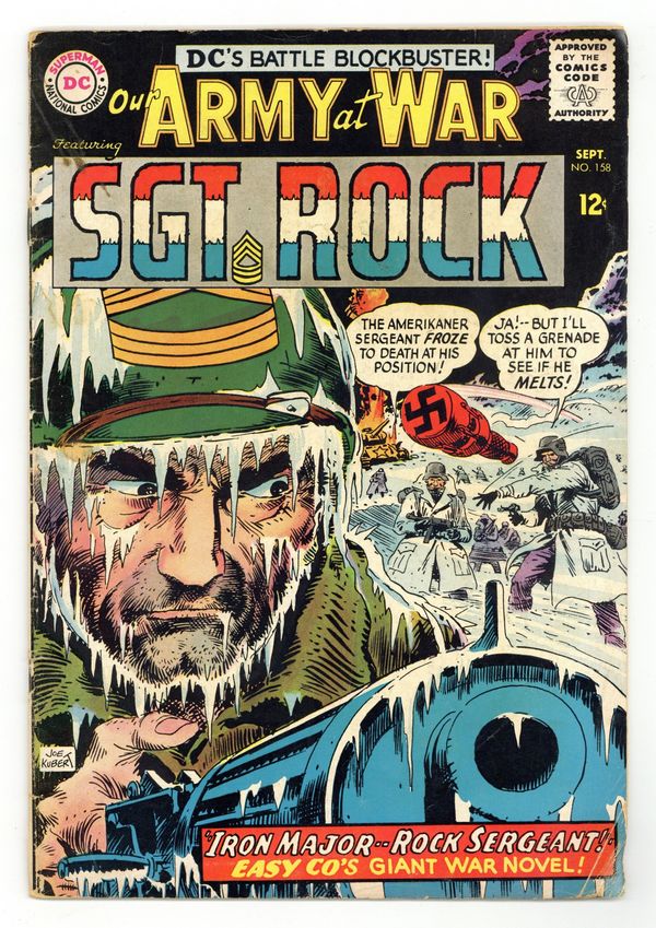 Cover art by Joe Kubert. Iron Major--Rock Sergeant starring Sgt. Rock, script by Bob Kanigher, art by Joe Kubert. Nazi hurls grenade at a chilly Rock. 36 Pages, Full Color. Cover price $0.12.