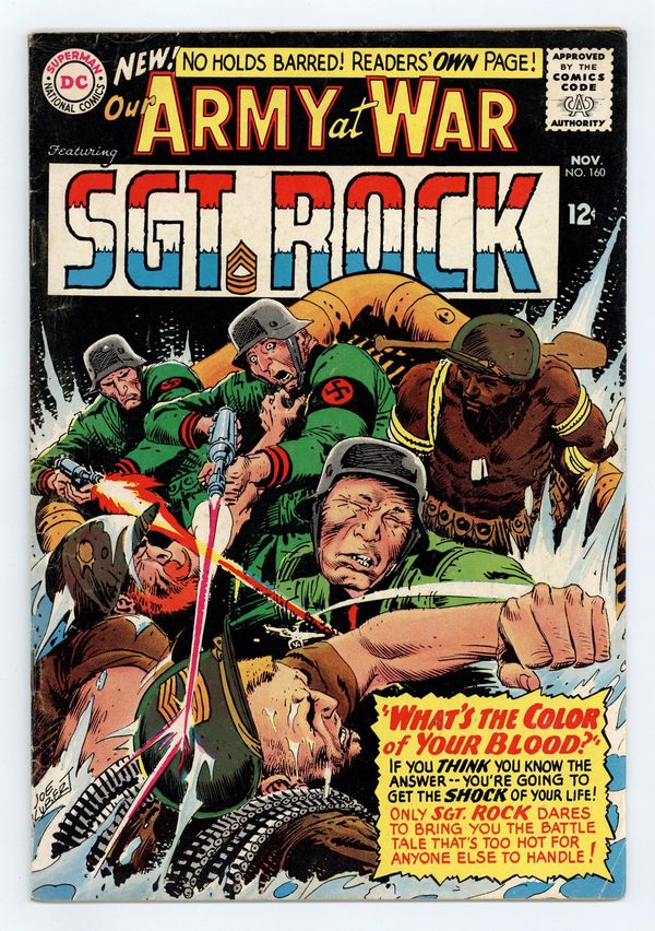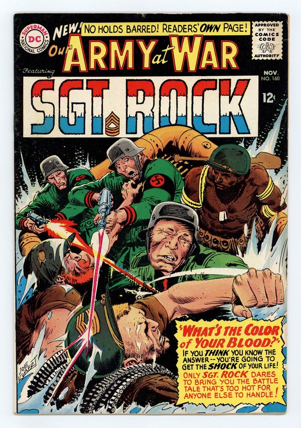 $22.50Cover art by Joe Kubert. What's the Color of Your Blood? starring Sgt. Rock, script by Bob Kanigher, art by Joe Kubert. The Hip Way to Learn! public service announcement, script by Jack Schiff, art by Sheldon Moldoff. Jackass Volunteer! starring Sgt. Mule, script by Hank Chapman, art by Jack Abel. 36 Pages, Full Color. Cover price $0.12.