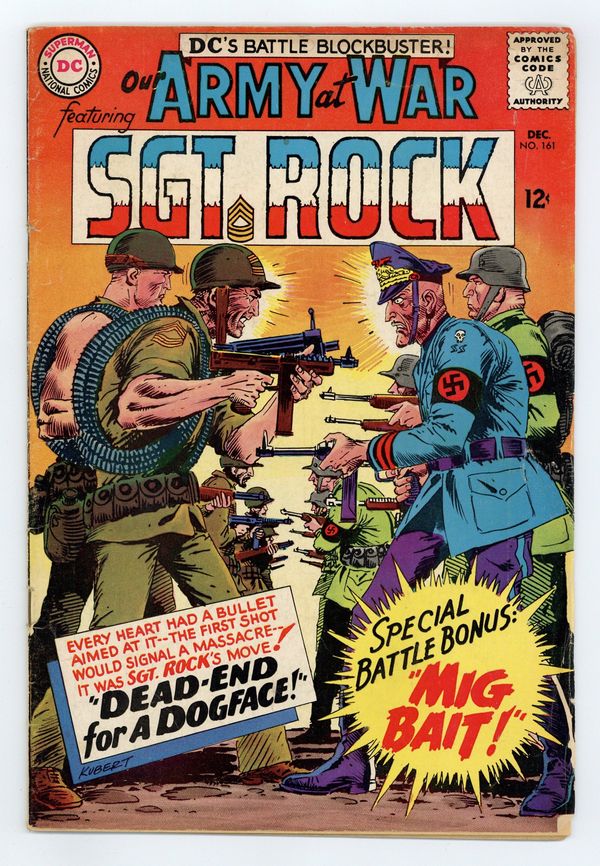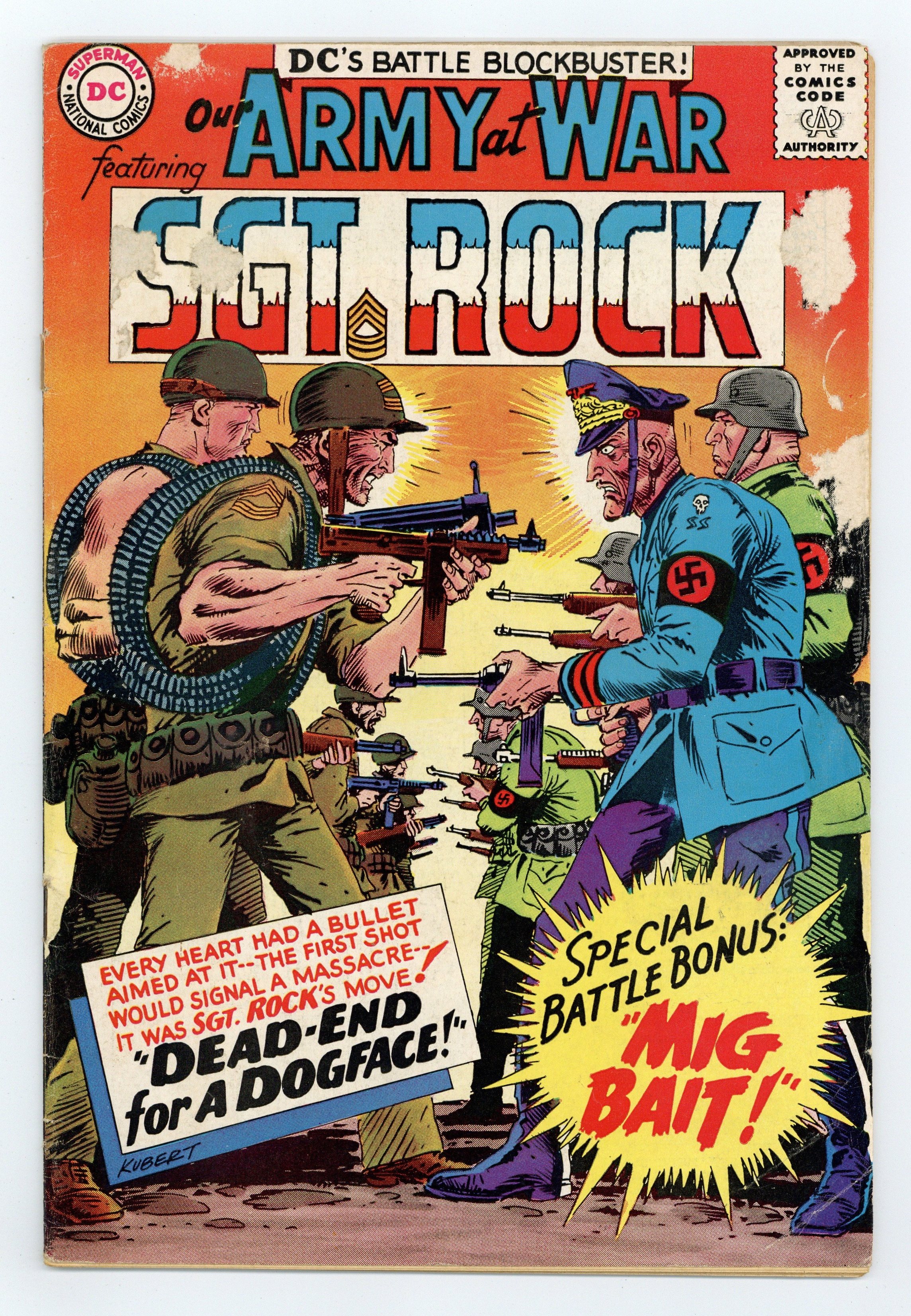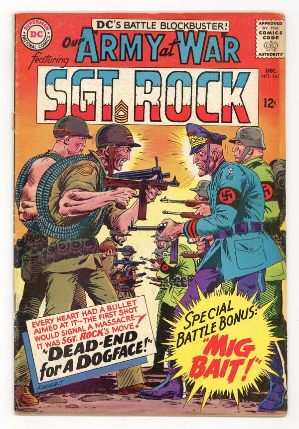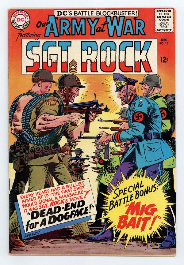 Cover art by Joe Kubert. Dead End For A Dogface starring Sgt Rock, script by Bob Kanigher, art by Joe Kubert. It's Sgt. Rock's move while everyone is pointing their gun at one another. MIG Bait, script by Hank Chapman, pencils by Ross Andru, inks by Mike Esposito. 36 Pages, Full Color. Cover price $0.12.