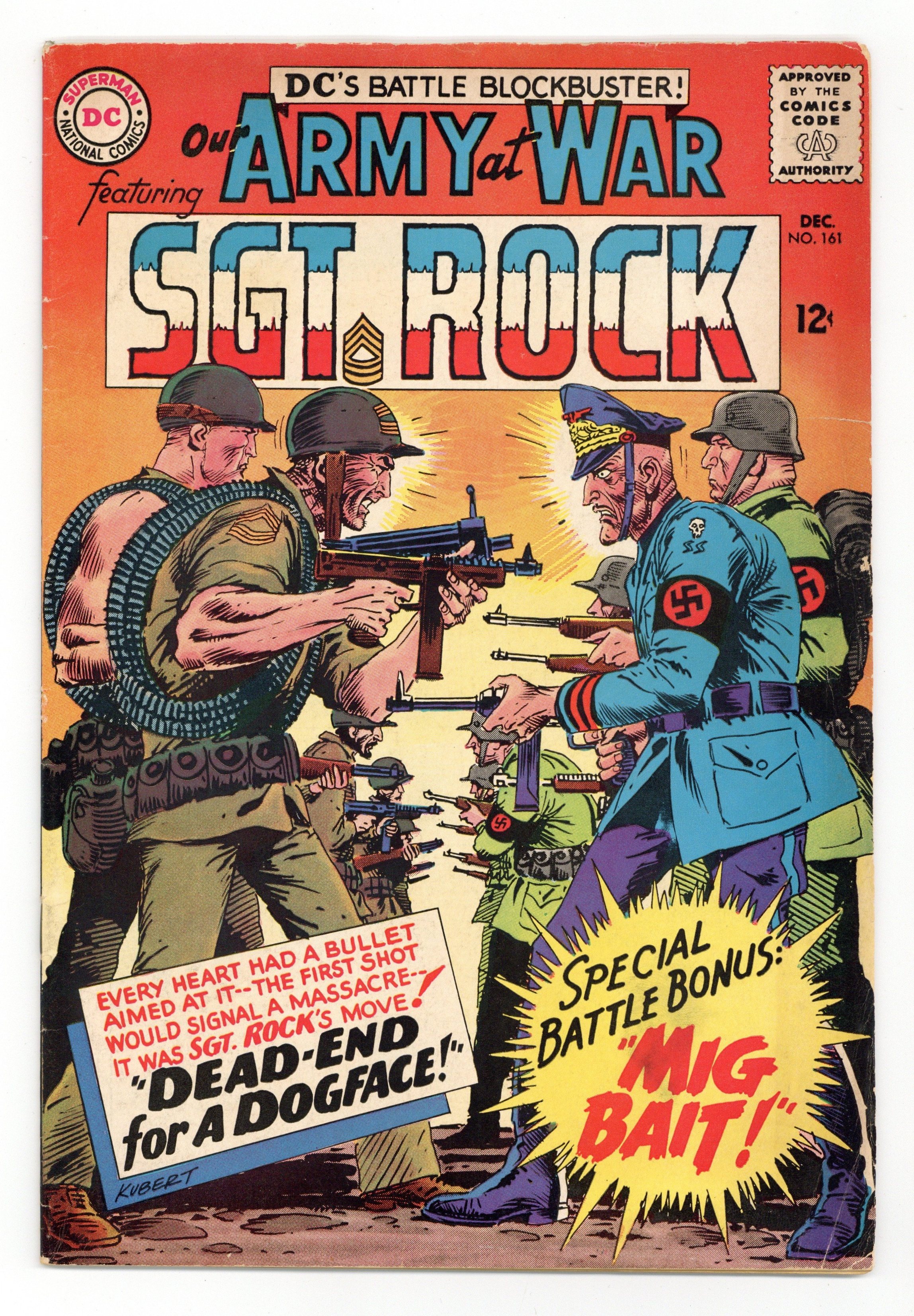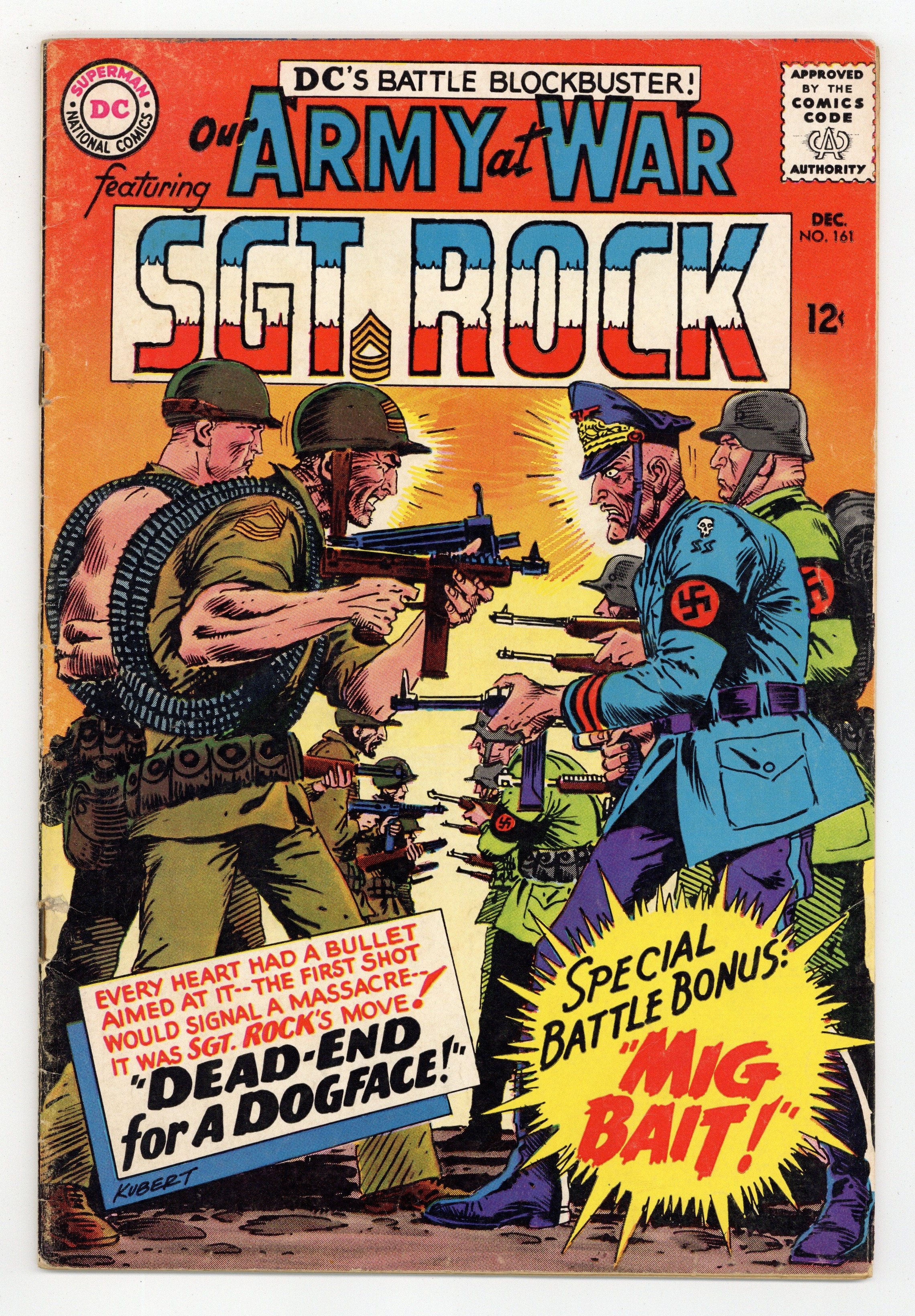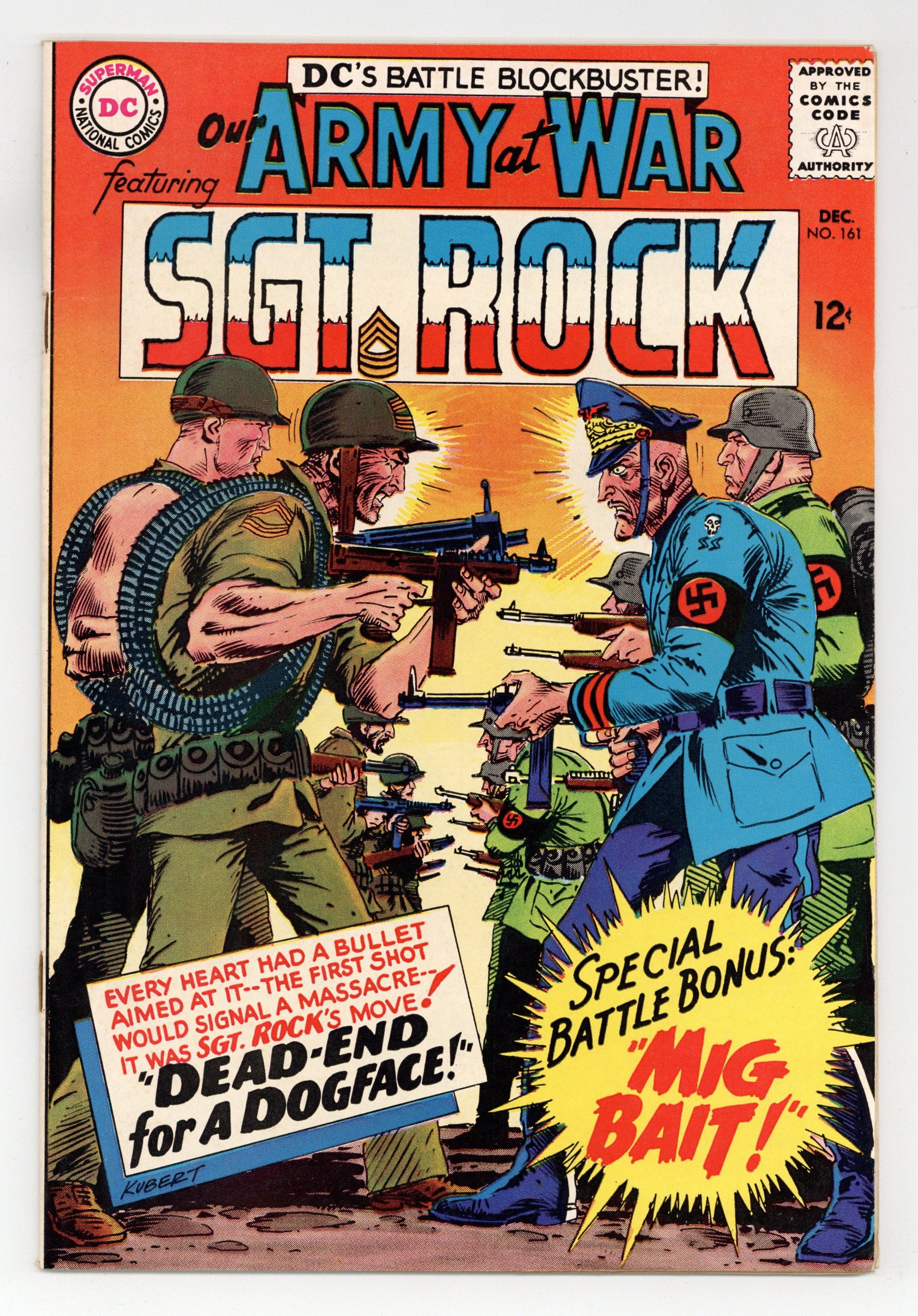 Cover art by Joe Kubert. Dead End For A Dogface starring Sgt Rock, script by Bob Kanigher, art by Joe Kubert. It's Sgt. Rock's move while everyone is pointing their gun at one another. MIG Bait, script by Hank Chapman, pencils by Ross Andru, inks by Mike Esposito. 36 Pages, Full Color. Cover price $0.12.