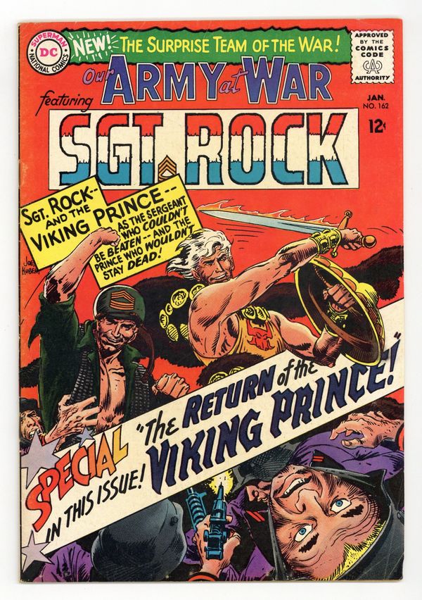 $20.50Cover art by Joe Kubert. The Prince and the Sergeant! starring Sgt Rock, script by Bob Kanigher, art by Joe Kubert. The return of the Viking Prince. Dirty Little War!, script by Hank Chapman, art by Gene Colan. Private Diary humor page. 36 Pages, Full Color. Cover price $0.12.