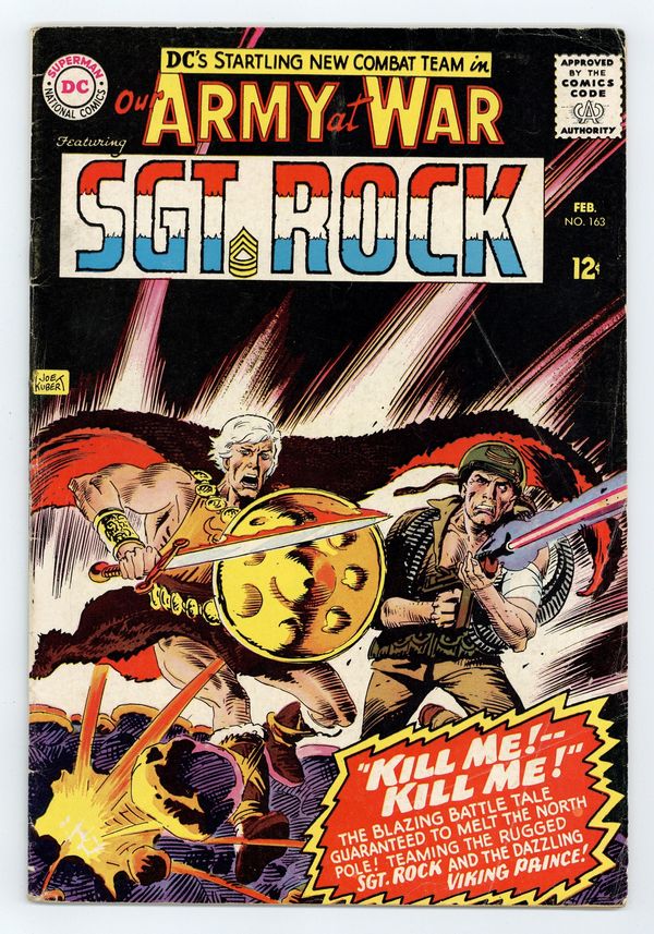 Cover by Joe Kubert. Stories by Robert Kanigher and Hank Chapman. Art by Joe Kubert and Jack Abel. The blazing battle tale teaming the rugged Sgt. Rock and the dazzling Viking Prince continues! Don't miss DC's startling new combat team in "Kill Me -- Kill Me!" by Robert Kanigher and Joe Kubert (continued from #162). Plus: Back-up story "My Hands Are a Bomb Bay!" by Hank Chapman and Jack Abel. And: untitled Regimental Shields illo. 32 pages, full color. Cover price $0.12.