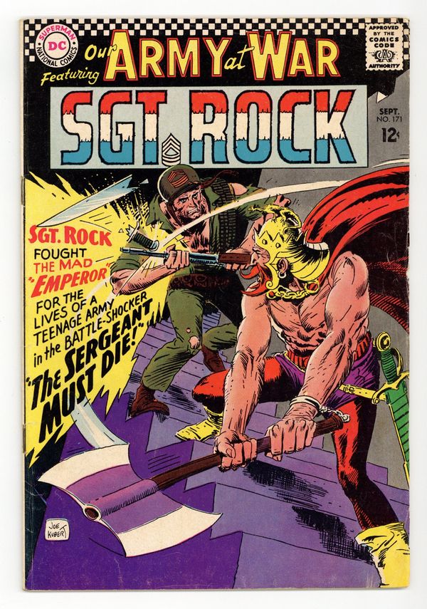 Cover art by Joe Kubert. The Sergeant Must Die starring Sgt Rock, script by Robert Kanigher, art by Joe Kubert. Combat Mile, pencils by Ross Andru, inks by Mike Esposito. Get Hip To Old Folks! public service announcement. Agent Zero M: Captured by Enemy Spies ad. Agent Zero M: Captured by Enemy Spies ad. 36 Pages, Full Color. Cover price $0.12.