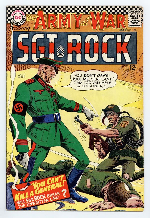 $22.00Cover art by Joe Kubert. You Can't Kill A General starring Sgt Rock, script by Bob Kanigher, art by Russ Heath. Frogman Roulette, script by Hank Chapman, art by Jack Abel. Ride the High Seas with Boaterific ad for Ideal toys, art by Kurt Schaffenberger. Letters page art by Kubert. 36 Pages, Full Color. Cover price $0.12.