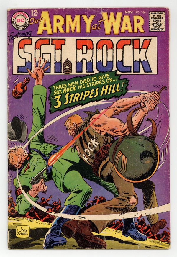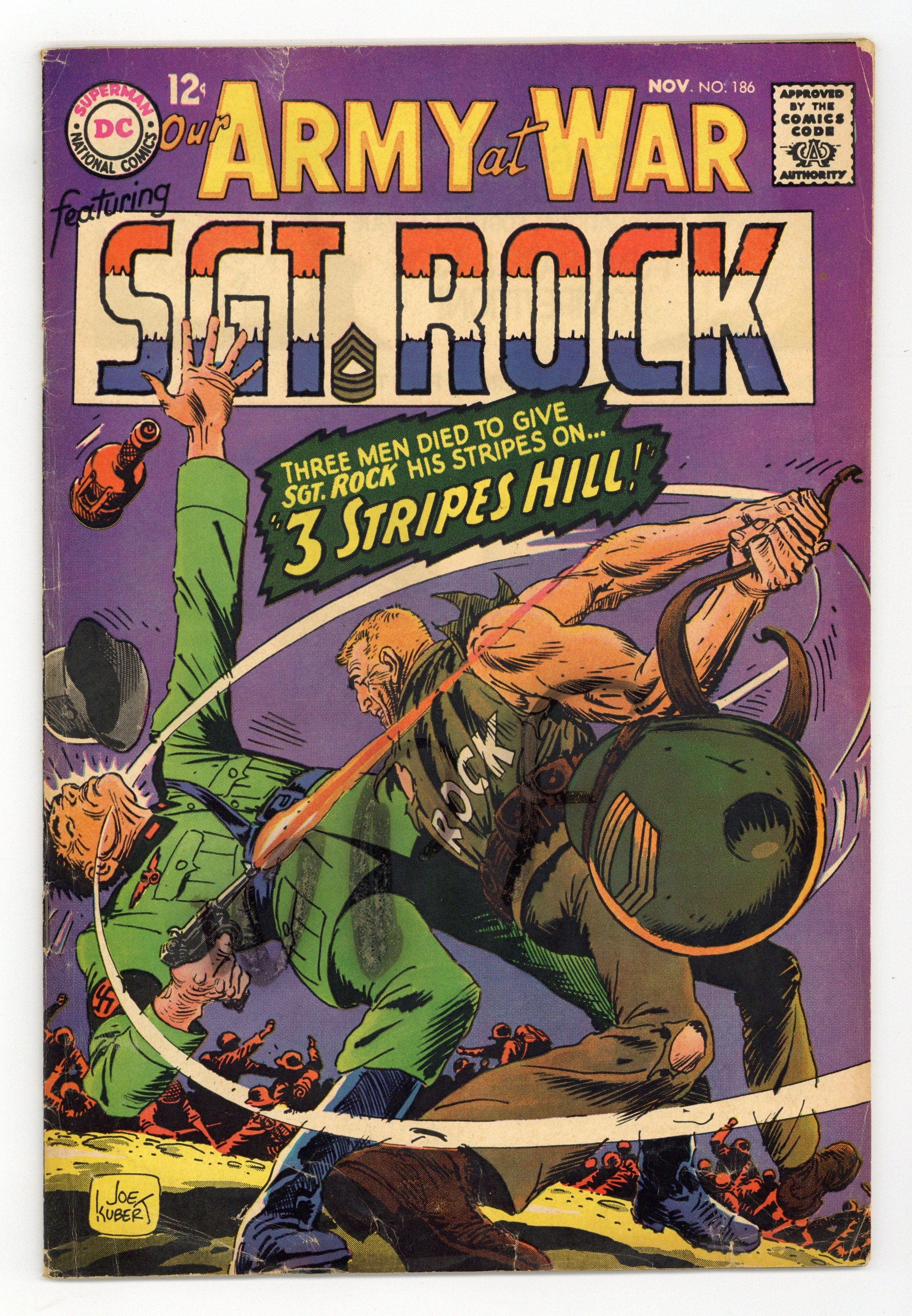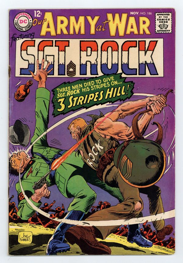 Cover art by Joe Kubert. 3 Stripes Hill! starring Sgt. Rock and Nick Barton, script by Bob Kanigher, art by Joe Kubert. My Life For A Medal, script by Hank Chapman, art by Neal Adams. Letter column art by Kubert. World War II PT Boats fact page. 36 Pages, Full Color. Cover price $0.12.