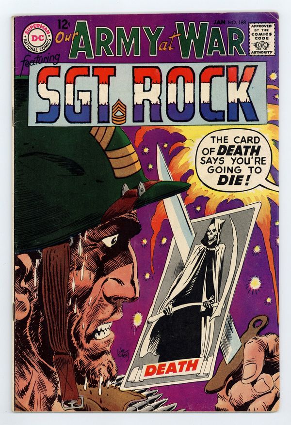 $17.50Cover art by Joe Kubert. Death Comes For Easy starring Sgt. Rock, script by Bob Kanigher, art by Joe Kubert. Live Wire For Easy, script by Robert Kanigher, pencils by Ross Andru, inks by Mike Esposito. Khaki-Yaks humor page by Henry Boltinoff. Cap's Hobby Hints by Henry Boltinoff. Letter column art by Kubert. 36 Pages, Full Color. Cover price $0.12.