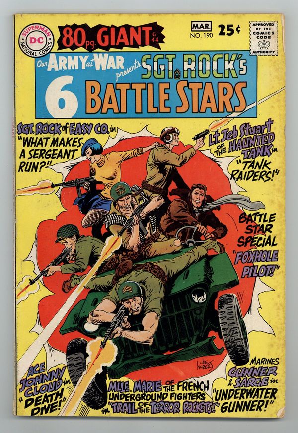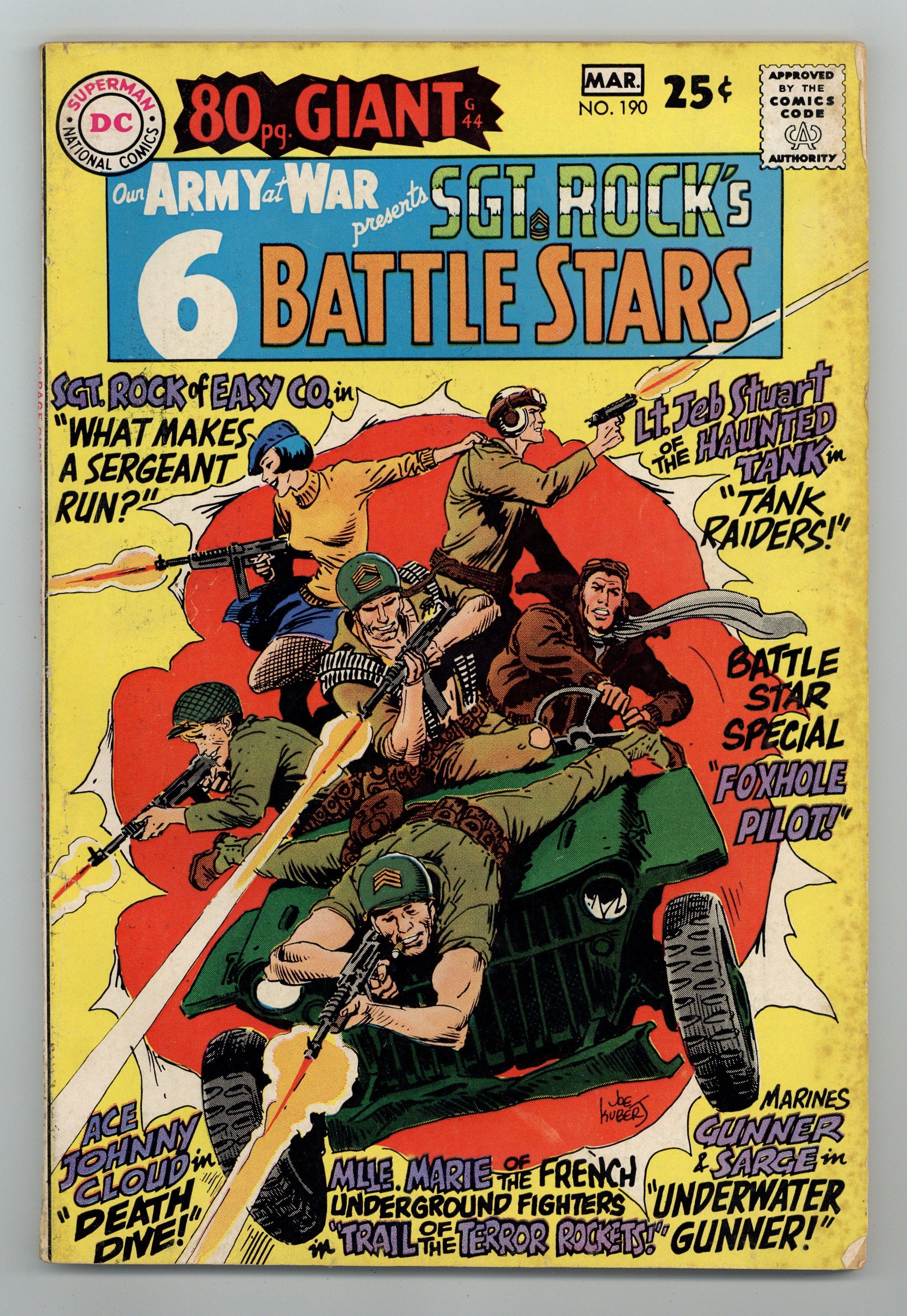 $20.50Cover art by Joe Kubert. What Makes A Sergeant Run? starring Sgt Rock, script by Robert Kanigher, art by Joe Kubert. Tank Raiders starring Haunted Tank, script by Bob Kanigher, art by Russ Heath. Death Dive starring Johnny Cloud, script by Robert Kanigher, art by Irv Novick. Jumping Jeep, script by Robert Kanigher, art by Joe Kubert. Trail of the Terror Rockets! starring Mademoiselle Marie, script by Robert Kanigher, art by Mort Drucker. Underwater Gunner! starring Gunner and Sarge, script by Robert Kanigher, art by Joe Kubert. Foxhole Pilot!, script by Robert Kanigher, art by Irv Novick. 84 Pages, Full Color. Cover price $0.25.