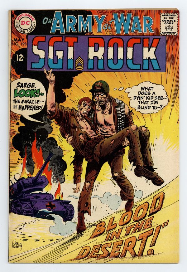 $14.00Cover art by Joe Kubert. Blood In the Desert starring Sgt. Rock, script by Bob Kanigher, art by Joe Kubert. Frogman Delivery, art by Russ Heath. Letter column art by Kubert. Direct Currents DC ad, pencils by Neal Adams and Ross Andru, inks by Mike Esposito and Jack Adler. 36 Pages, Full Color. Cover price $0.12.