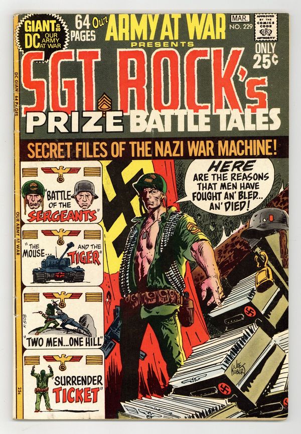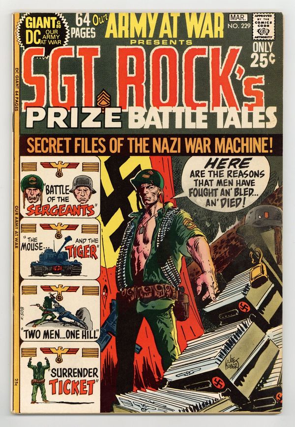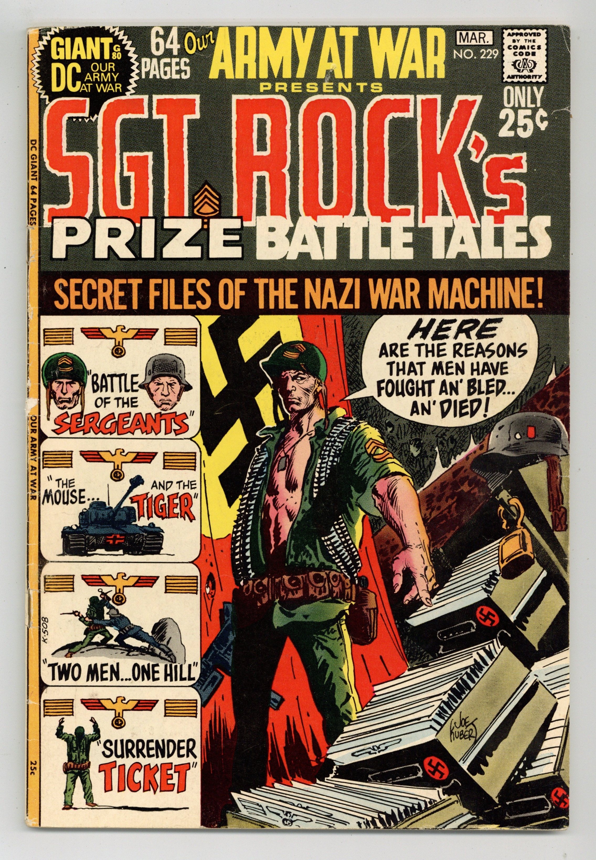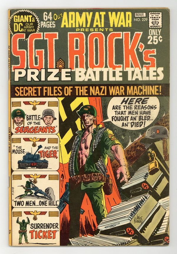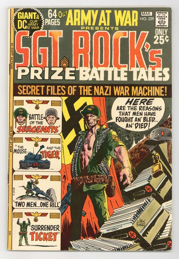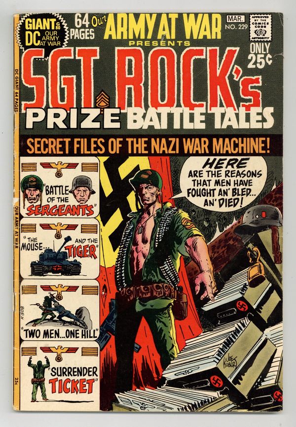 $20.50Cover art by Joe Kubert. The Battle of the Sergeants starring Sgt. Rock, script by Bob Kanigher, art by Joe Kubert. The Mouse and the Tiger, pencils by Ross Andru, inks by Mike Esposito. The Fighting Blip, script by Bob Haney, art by Jack Abel. Two Men--One Hill, script by Bob Haney, art by Mort Drucker. Surrender Ticket starring Sgt. Rock, script by Bob Kanigher, art by Joe Kubert. 68 Pages, Full Color. Cover price $0.25.