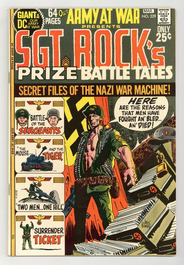 Cover art by Joe Kubert. The Battle of the Sergeants starring Sgt. Rock, script by Bob Kanigher, art by Joe Kubert. The Mouse and the Tiger, pencils by Ross Andru, inks by Mike Esposito. The Fighting Blip, script by Bob Haney, art by Jack Abel. Two Men--One Hill, script by Bob Haney, art by Mort Drucker. Surrender Ticket starring Sgt. Rock, script by Bob Kanigher, art by Joe Kubert. 68 Pages, Full Color. Cover price $0.25.
