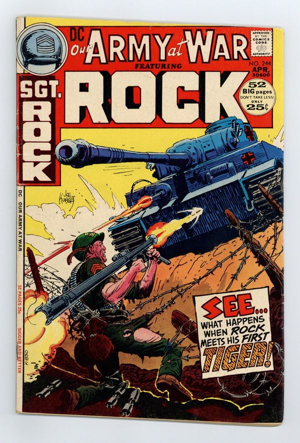 $25.50Cover art by Joe Kubert. Easy's First Tiger starring Sgt. Rock, script and art by Russ Heath. Wheel for a Fort, script by Bob Haney, art by Mort Drucker. The Pin-Up Tank, script by Bob Haney, pencils by Ross Andru, inks by Mike Esposito. The Silent Tin Can, art by Jack Abel. What Do They Know About War? featuring USS Stevens, script and art by Sam Glanzman. 52 Pages, Full Color. Cover price $0.25.