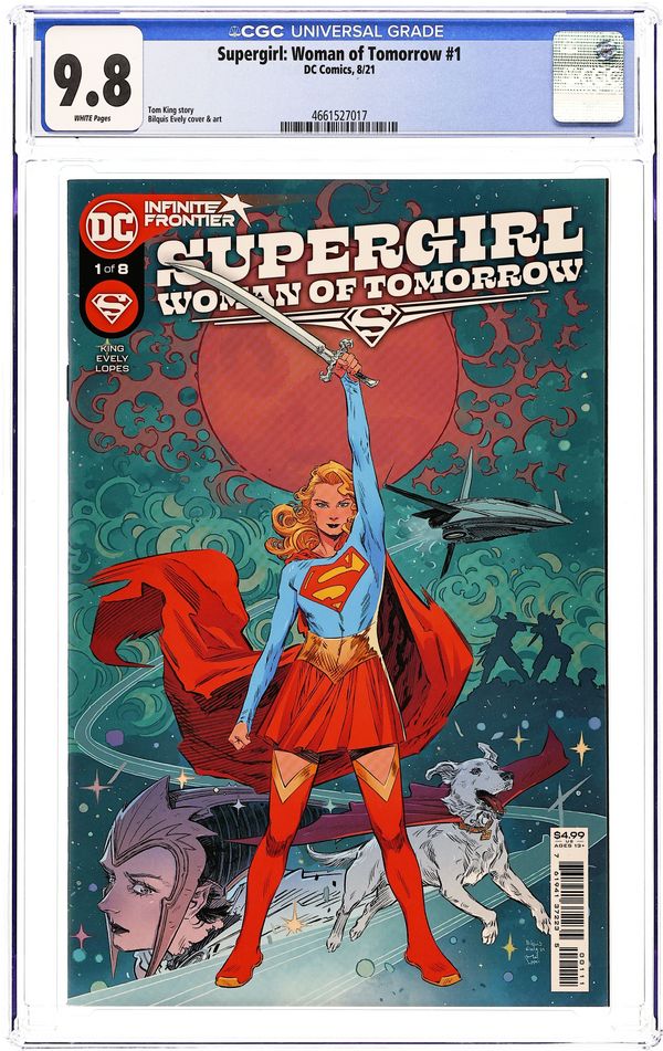 Written by Tom King. Art and Cover by Bilquis Evely. Kara Zor-El has seen some epic adventures over the years, but finds her life without meaning or purpose. Here she is, a young woman who saw her planet destroyed and was sent to Earth to protect a baby cousin who ended up not needing her. What was it all for? Wherever she goes, people only see her through the lens of Supermans fame. Just when Supergirl thinks shes had enough, everything changes. An alien girl seeks her out for a vicious mission. Her world has been destroyed, and the bad guys responsible are still out there. She wants revenge, and if Supergirl doesnt help her, shell do it herself, whatever the cost. Now a Kryptonian, a dog, and an angry, heartbroken child head out into space on a journey that will shake them to their very core. 32 pages, full color. Rated T+ Cover price $4.99.
