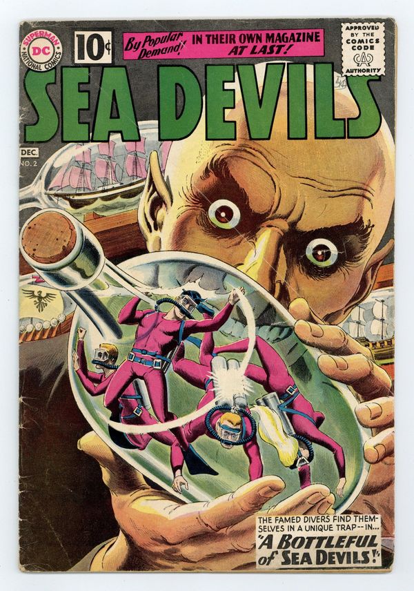Last 10-cent cover price. Cover by Russ Heath. "A Bottleful of Sea Devils!", script by Bob Haney, art by Russ Heath; The Sea Devils are helping the Navy test a device that stops motors underwater when it it stolen by Mr. Neptune. "Sea Devils Battle Diary," art by Russ Heath. "Star of the Sea!", script by Bob Haney, art by Russ Heath; The Sea Devil's pet seal, Pappy, saves them repeatedly during his first trip to the ocean. 36 pgs., full color. $0.10. Cover price $0.10.