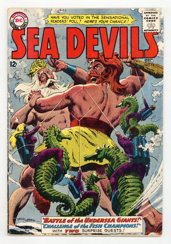 Cover by Russ Heath. "War of the Underwater Giants!", script by France Herron, art by Irv Novick; Zeus challenges Hercules to defeat Neptune but their battle could destroy the oceans unless the Sea Devils can stop it. "Wonders of the Water World..."; Four panels with text detailing science facts about water. "Challenge of the Fish Champions!" script by France Herron, art by Jack Abel; The Sea Devils enter an underwater relay race to raise money for the Junior Sea Devils but soon discover that their competition is not human. 36 pgs., full color. $0.12. Cover price $0.12.