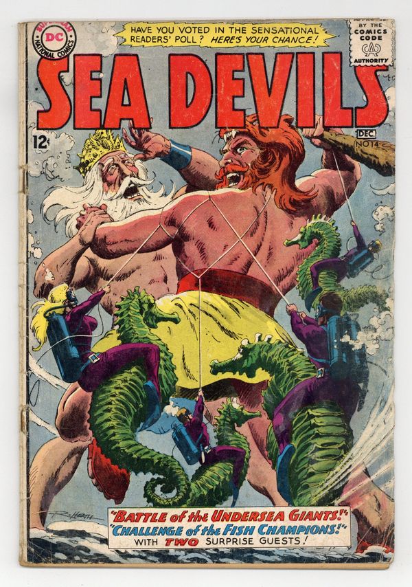 $19.50Cover by Russ Heath. "War of the Underwater Giants!", script by France Herron, art by Irv Novick; Zeus challenges Hercules to defeat Neptune but their battle could destroy the oceans unless the Sea Devils can stop it. "Wonders of the Water World..."; Four panels with text detailing science facts about water. "Challenge of the Fish Champions!" script by France Herron, art by Jack Abel; The Sea Devils enter an underwater relay race to raise money for the Junior Sea Devils but soon discover that their competition is not human. 36 pgs., full color. $0.12. Cover price $0.12.