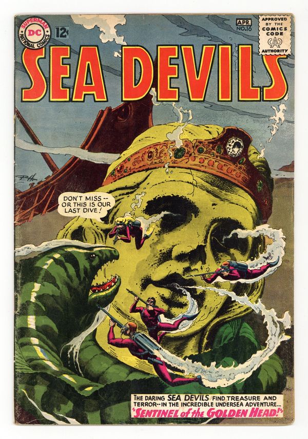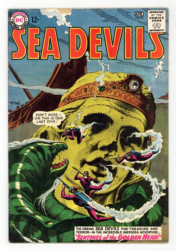 Cover by Russ Heath. "The Strange Reign of Queen Judy and King Biff," script by Hank Chapman, pencils by Bruno Premiani, inks by Sheldon Moldoff; A mysterious island appears for a single day each century; When the Sea Devils are trapped on the island they must escape before the island disappears again. "Sentinel of the Golden Head," script by Hank Chapman, pencils by Howard Purcell, inks by Sheldon Moldoff; The Sea Devils help the people of Blisspotamia put an end to an ancient curse. 36 pgs., full color. $0.12. Cover price $0.12.