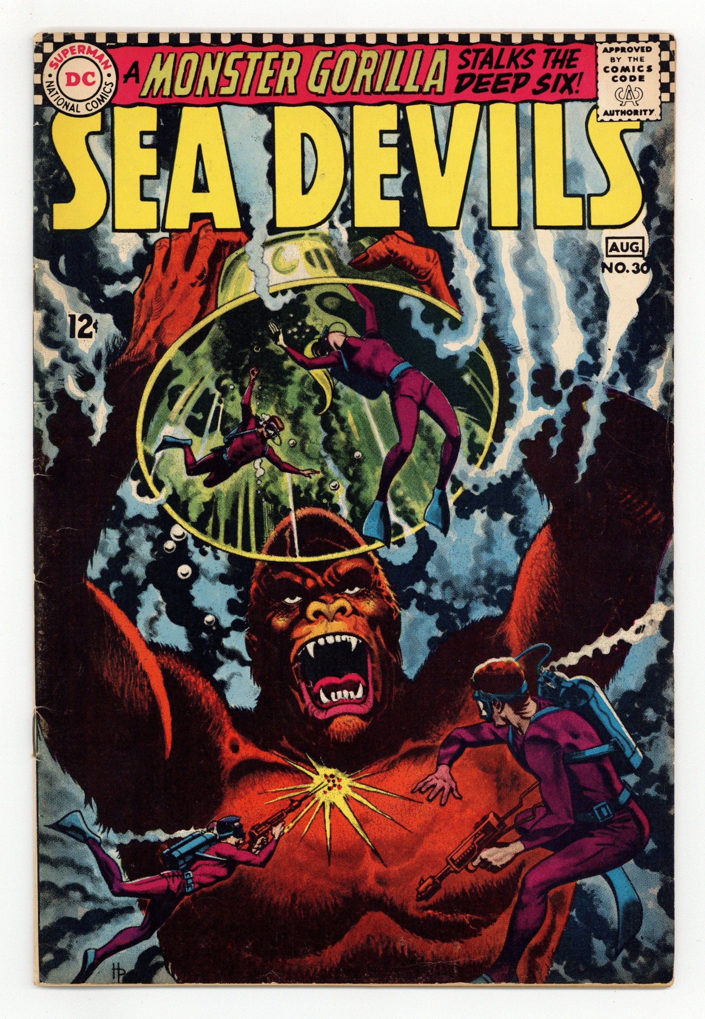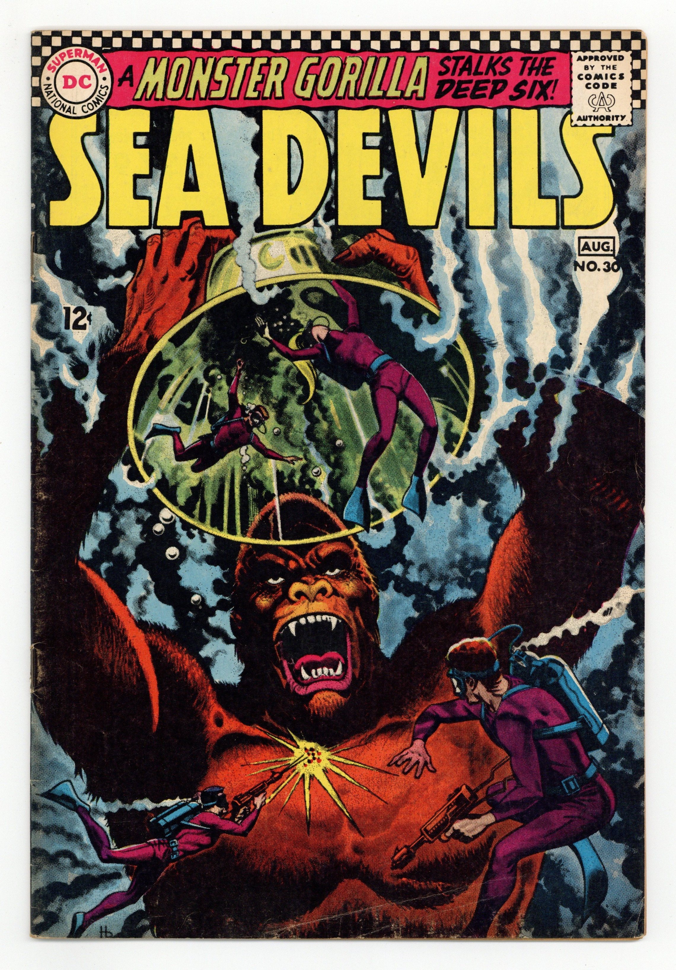 $17.50A Gorilla Prowls the Deep Six! - Written by unknown. Art by Howard Purcell and Sheldon Moldoff. Cover by Howard Purcell and Jack Adler (color and wash effects). The Sea Devils in a book-length thriller told in three chapters! Characters in this issue: Sea Devils [Dane Dorrance; Judy Walton; Nicky Walton; Biff Bailey]; Caesar the Chimp; Man-Fish; Professor Adams; Captain X; International Sea Devils; Molo. Plus: 1-page public service announcement "Natural Beauty--Everybody's Fight"! And: untitled Cap's Hobby Hints half-pager by Henry Boltinoff. 32 pages, full color. Cover price $0.12.