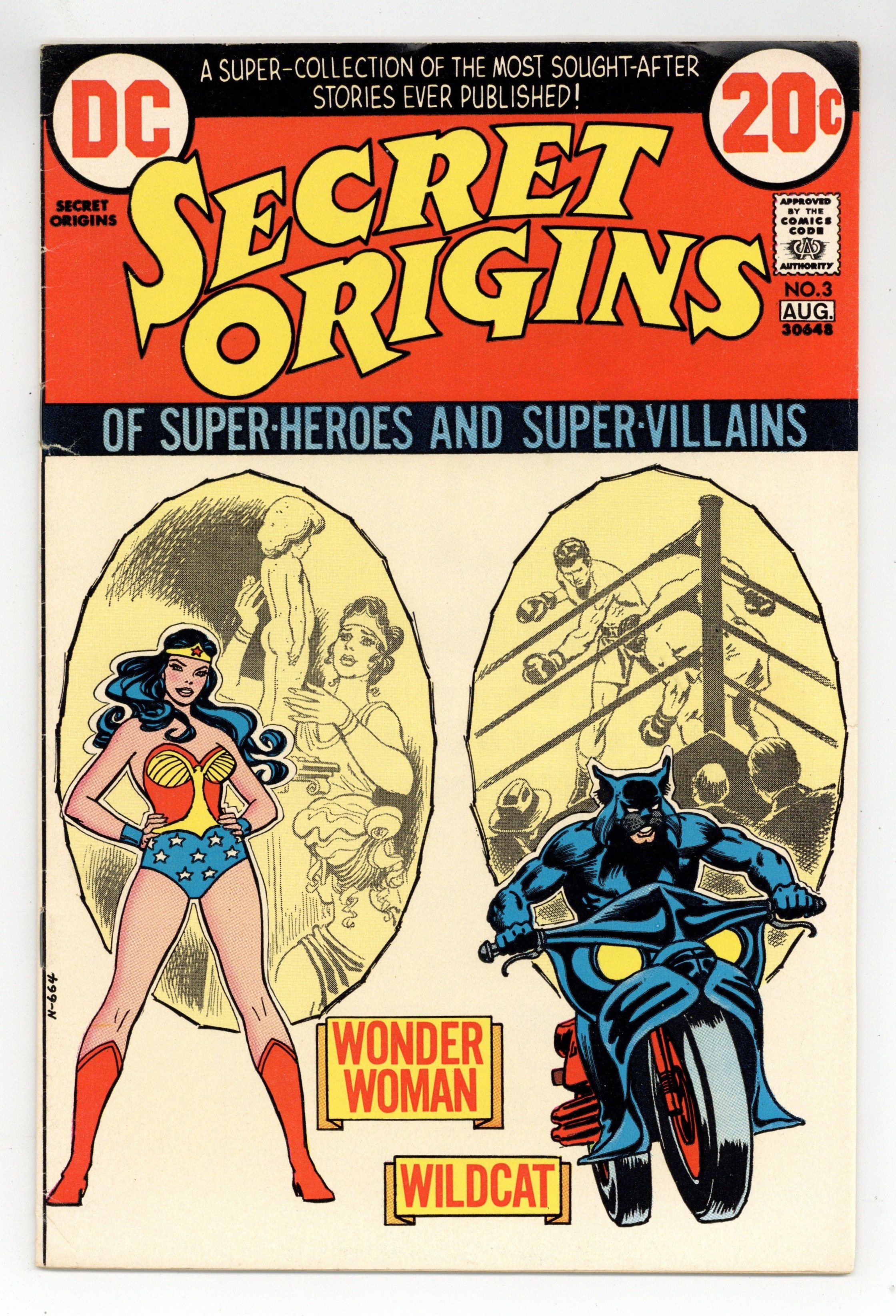 Cover by Nick Cardy. "The Origin of Wonder Woman," script by William Marston, art by Harry G. Peter; Upon her arrival in man's world, Wonder Woman drops an Amazon scroll that details the origin and early days of the Amazons, while later sources outline her birth, her youth, and her battle in the arena for the right to be Wonder Woman; reprinted from Wonder Woman #1. "This is the Story of Wildcat!", script by Bill Finger, art by Irwin Hasen; Boxer Ted Grant kills the former champ in the ring and is inspired by Green Lantern to adopt the identity of Wildcat to clear himself; reprinted from Sensation Comics #1. 36 pgs., full color. $0.20. Cover price $0.20.