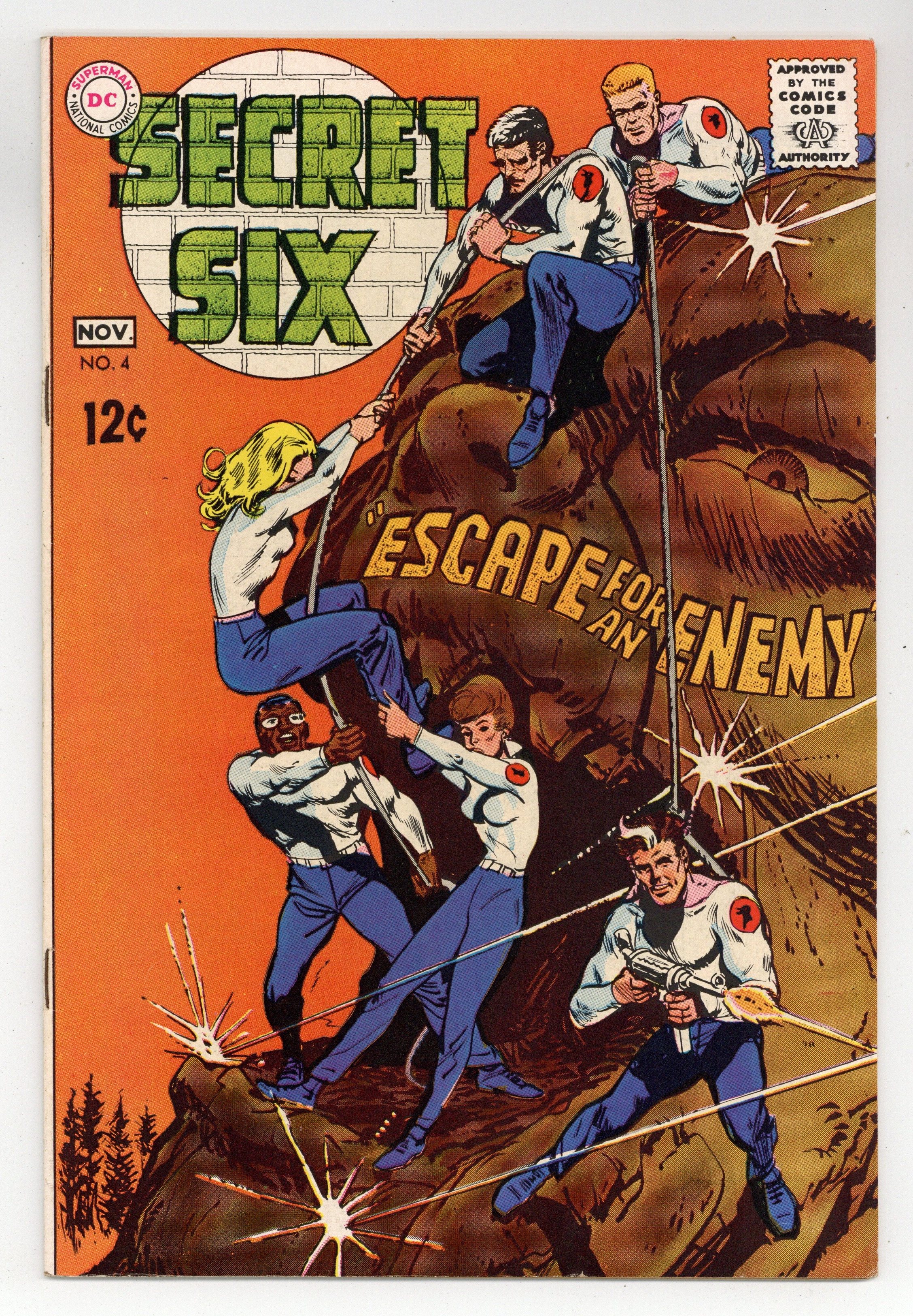 Cover art by Jack Sparling. Escape for an Enemy! starring Tiger Force, Crimson Dawn, King Savage, August Durant, Carlo Di Rienzi, Lili De Neuve, Mockingbird, General Pao, script by E. Nelson Bridwell and Joe Gill, art by Jack Sparling; the Secret Six are instructed to help an enemy of the state to escape a brutal guard that hold him captive. 36 pgs. $0.12. Cover price $0.12.