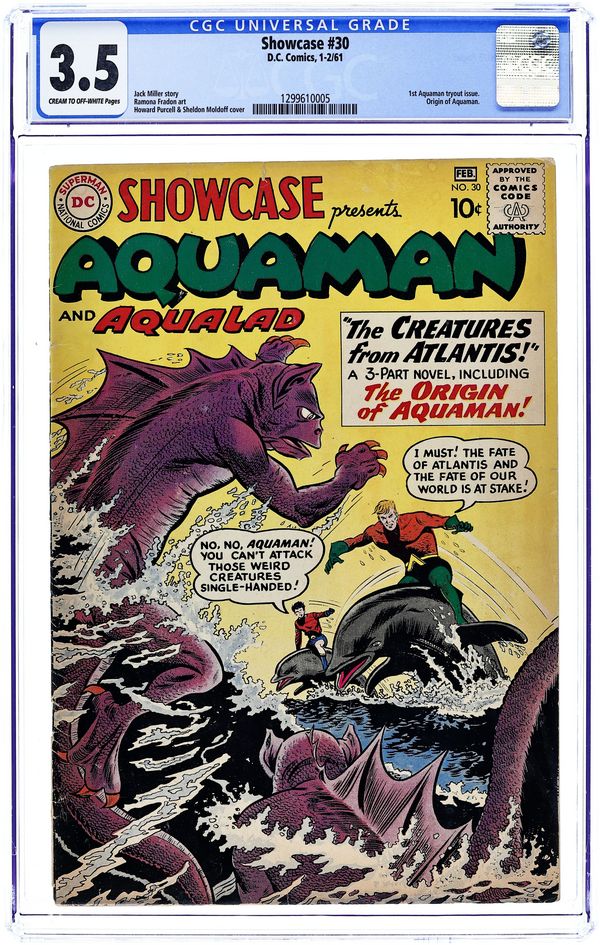 Cover pencils by Dick Dillin, inks by Sheldon Moldoff. The Creatures from Atlantis starring Aquaman and Aqualad, script by Jack Miller, art by Ramona Fradon; Aquaman gets an S.O.S. from Atlantis; Aquaman is captured, but he learns the plans of the Amphibious Aliens. The Battle of the Sea Creatures starring Aquaman and Aqualad, script by Jack Miller, art by Ramona Fradon; Aquaman and Aqualad stop amphibious aliens and force them back to their own dimension. 36 Pages, Full Color. Cover price $0.10.