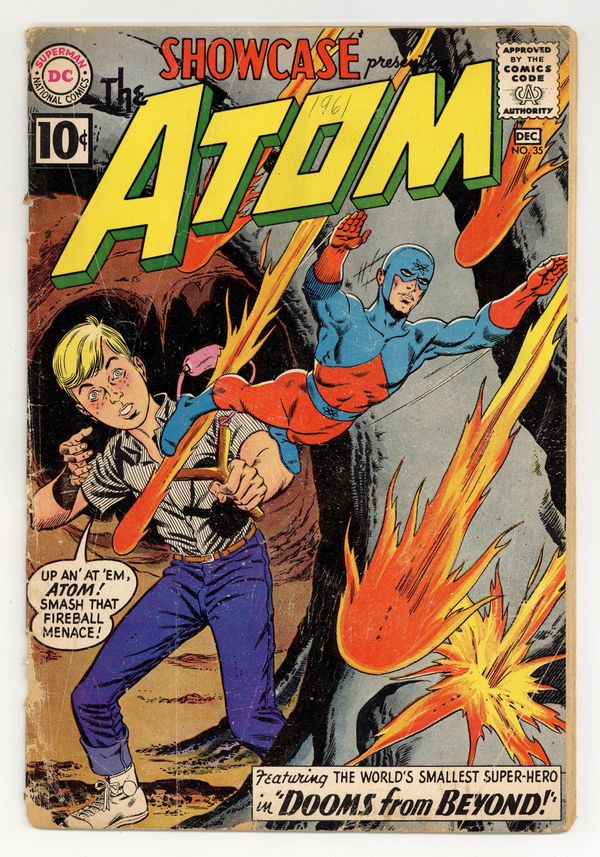 Cover pencils by Gil Kane, inks by Murphy Anderson. 2nd Silver Age Atom appearance in "The Dooms from Beyond!", script by Gardner Fox, pencils by Gil Kane, inks by Murphy Anderson; When Dr. Gordon Doolin is preparing to look for funding to build a hospital in a third world country, he learns that he's really the heir to the Heath fortune; In spite of the fact that there is a family curse, Doolin legally changes his name back to Heath to collect the fortune before the deadline; Taking up residence in his grandfather's old home, Doolin apparently becomes a target of the ancient curse; Ray Palmer gets involved because Jean is the lawyer in charge of executing the will; As the Atom, Ray manages to protect Doolin from the various apparent curses comprised of the various elements. 2-page text feature with autobiographies of Fox, Kane, and Anderson. 36 Pages, Full Color. Cover price $0.10.