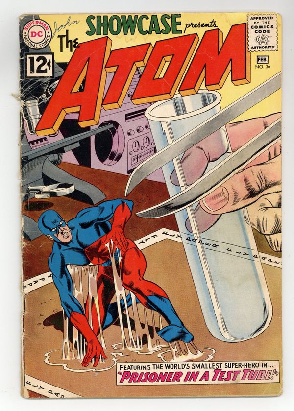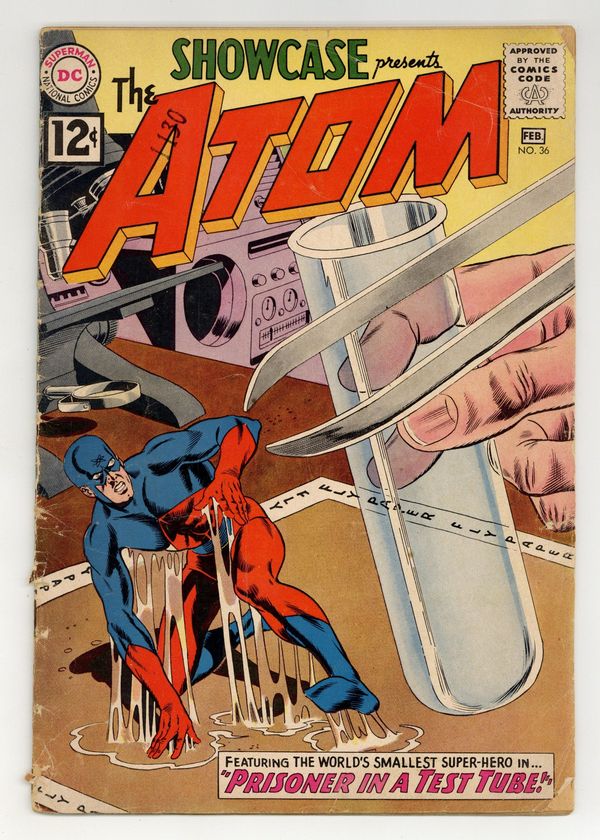 First 12-cent cover price. Cover pencils by Gil Kane, inks by Murphy Anderson. 3rd appearance of the Silver Age Atom in Prisoner in a Test Tube!, script by Gardner Fox, pencils by Gil Kane, inks by Murphy Anderson; A master spy assumes the identity of a scientist to get close to Professor Loring, who builds "super weapons"; Jean checks his fingerprints and finds a fraud. Ray Palmer offers to contact "our friend, The Atom. Ad for Mystery in Space #73. Ad for Green Lantern #10 and Flash #126. Ad for Giant 80-Page Superman Annual #4. Letter to the editor from comics fandom pioneer Jerry Bails. Strange Realm of the Atom!; Educational info about atomic energy and atoms. The "Disappearing Act" Robberies!, script by Gardner Fox, pencils by Gil Kane, inks by Murphy Anderson; Ray once again proposes to Jean, but she's distracted by "invisible robberies" of jewelry all over town; The Atom attends a chess match with a platinum chess set and hides in a rook. Ad for Strange Adventures #136 and Justice League #9. Ad for Giant Batman 80-Page Annual #2. 36 Pages, Full Color. Cover price $0.12.