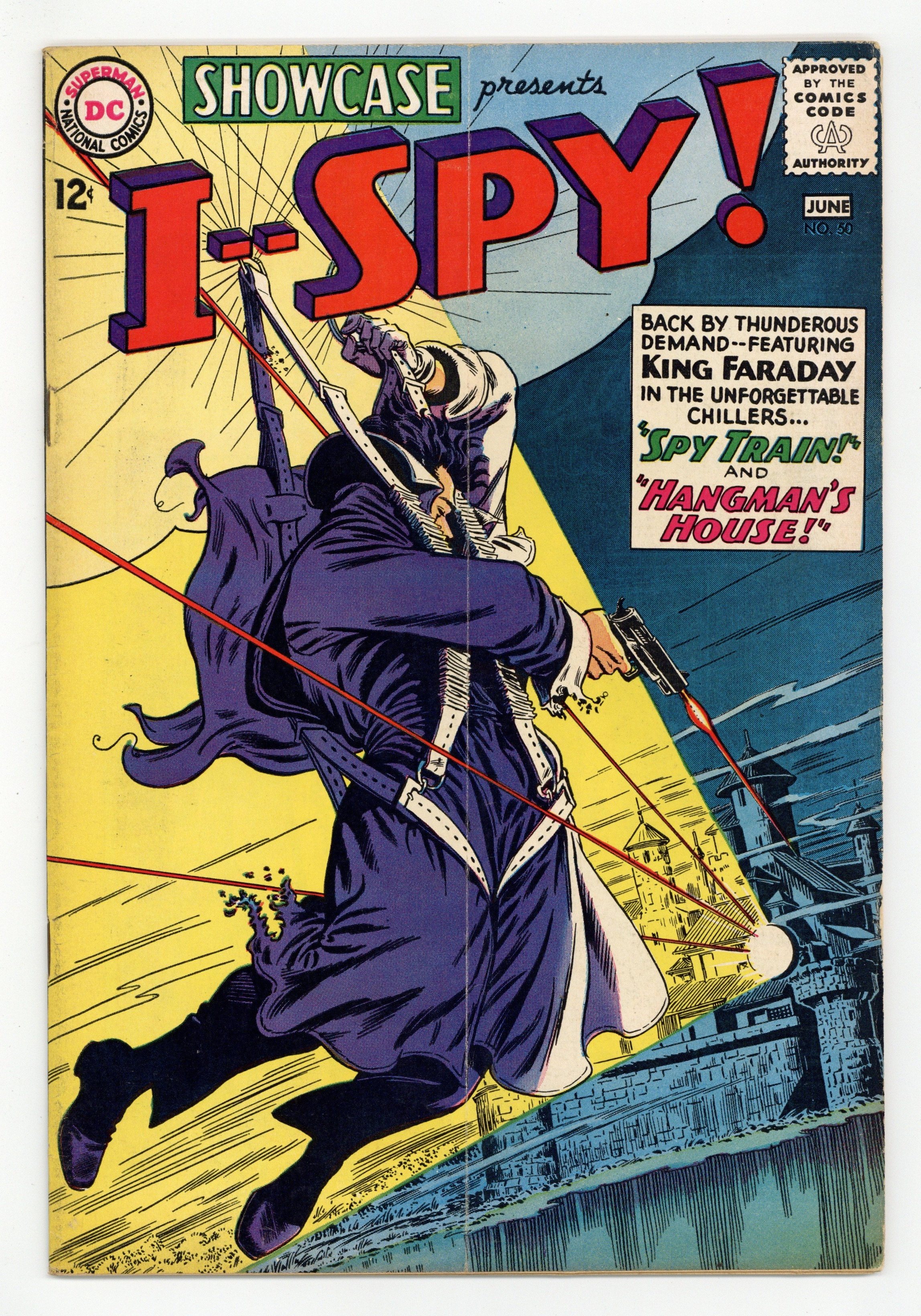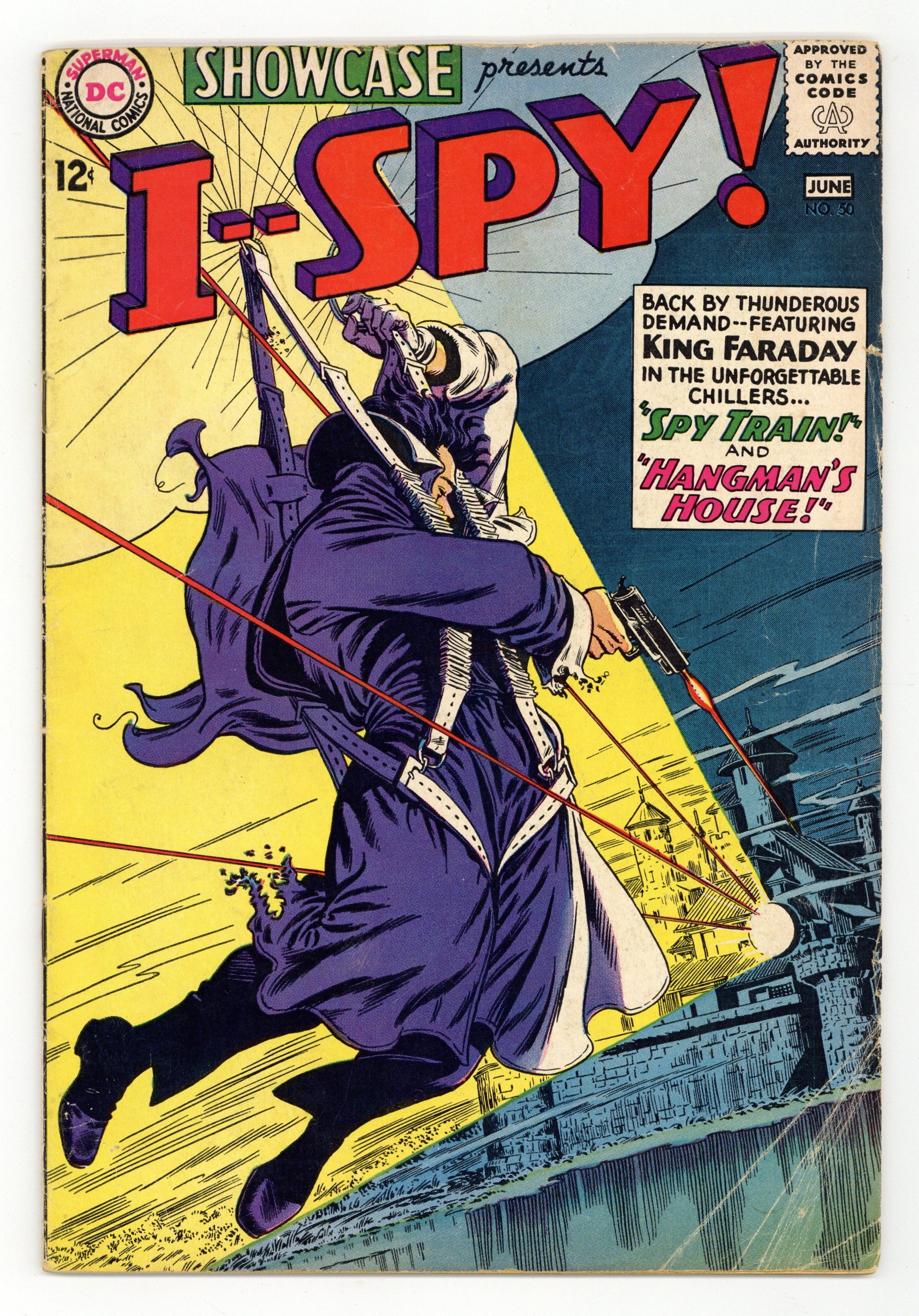 Cover pencils by Carmine Infantino, inks by Murphy Anderson. I – Spy, script by Robert Kanigher, pencils by Carmine Infantino, inks by Murphy Anderson (new material). Spy Train starring King Faraday, script by Robert Kanigher, pencils by Carmine Infantino, inks by Joe Giella; King Faraday, on the trail of a killer, rides the Orient Express, where he meets a movie starlet and a camera-happy tourist; two attempts are made on Faraday's life. Hangman's House starring King Faraday, script by Robert Kanigher, pencils by Carmine Infantino, inks by Joe Giella. 36 Pages, Full Color. Cover price $0.12.