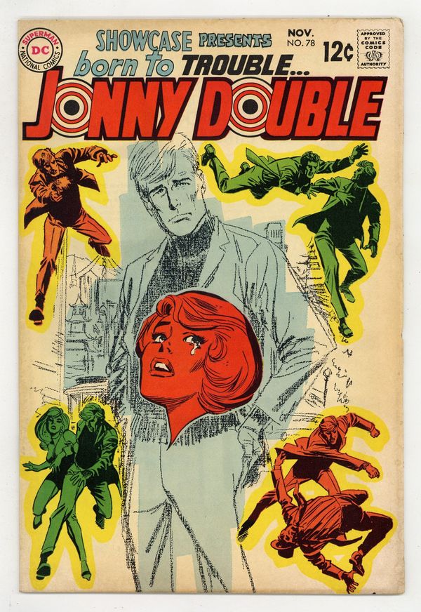 Cover art by Dick Giordano. 1st appearance of Jonny Double in Meet Jonny Double!.. Chapter 1, script by Marv Wolfman (story) and Joe Gill (dialogue), art by Jack Sparling; A down-beat Don Quixote... a once-white knight in counterfeit armor, the poor man's Peter Pan!; Jonny Double, ex-cop and now PI, is awoken only to be ejected by his landlord; Relocating, he gets a call. Mr. Twain has the picture of his twin brother, a syndicate man who was murdered. Ad for Angel and the Ape #1. Chapter 2, script by Marv Wolfman (story) and Joe Gill (dialogue), art by Jack Sparling; Beaten, Jonny gets sympathy from "Crys" Cross, a blonde waitress; Mr. Twain's brother dealt with Piker and Glass, respectable businessmen; Jonny goes to their office, is turned away, but disguises as a janitor to slip in. Ad for The Geek #1. Half-page text feature on Joe Kubert. Blurb for the first DC Special honoring Carmine Infantino. Love Finds the Inquiring Fanatic! article on Angel and the Ape. Chapter 3, script by Marv Wolfman (story) and Joe Gill (dialogue), art by Jack Sparling; Jonny kicks back, and the goon goes over the rail to a fatal fall; More goons pursue. Jonny runs into an amusement park, then the House of Horrors. Ad for Justice League of America #67, pencils by Neal Adams. Ad for Showcase #79. Ad for Beware the Creeper #4. Ad for World's Finest #180 and Superman #211. 36 Pages, Full Color. Cover price $0.12.