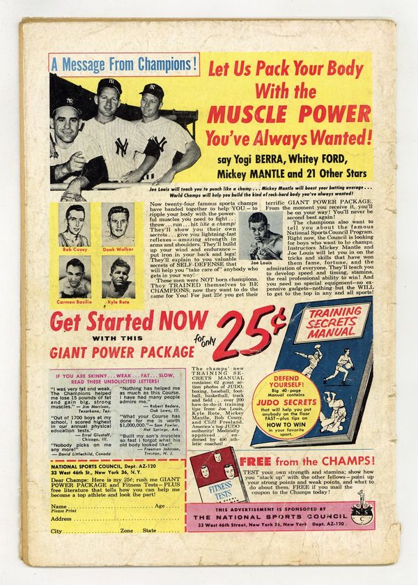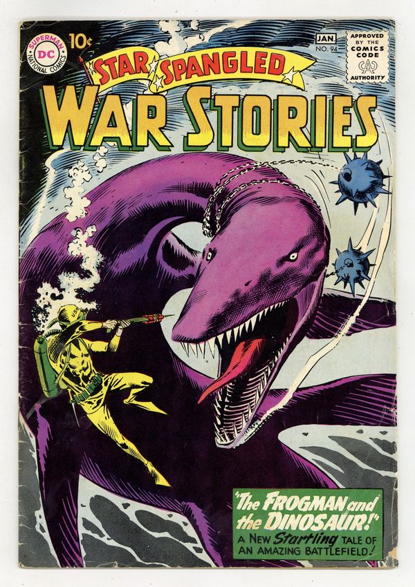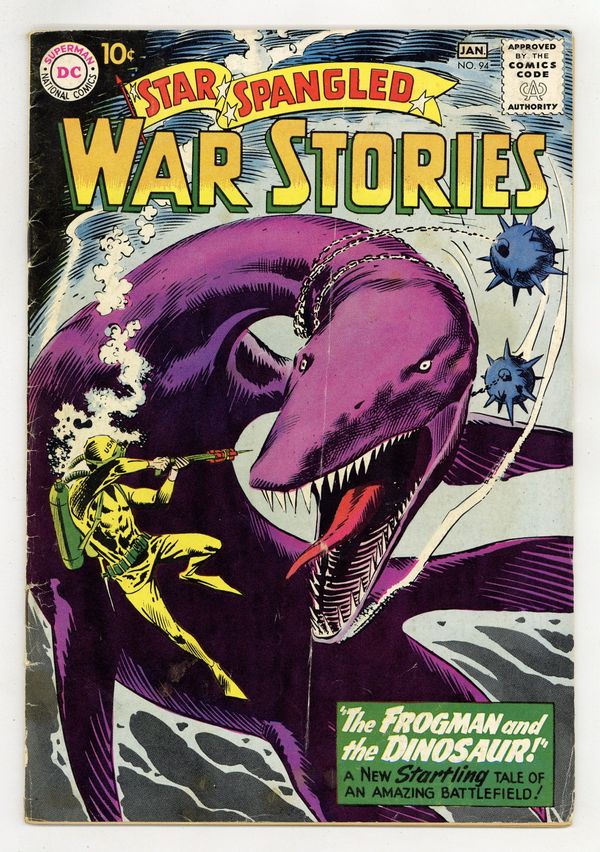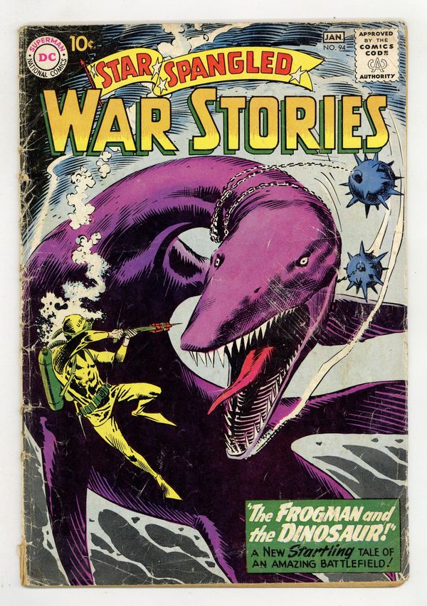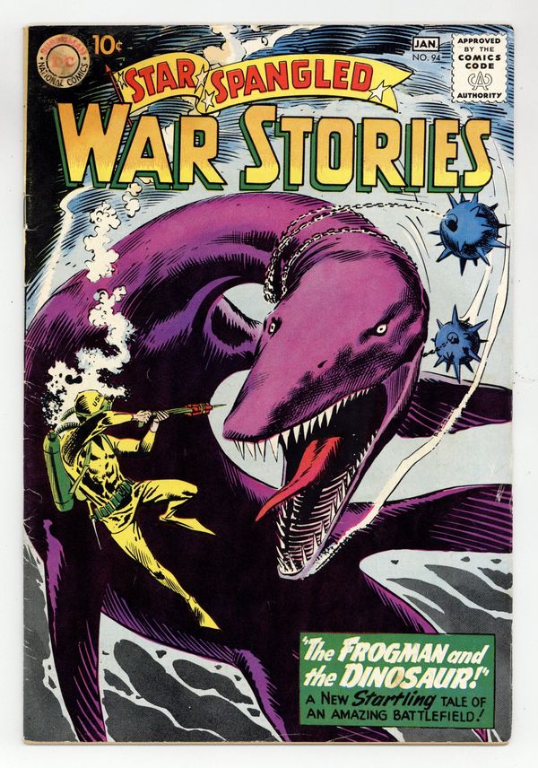 Cover art by Joe Kubert. The Frogman and the Dinosaur, script by Robert Kanigher, pencils by Ross Andru, inks by Mike Esposito. Ghost Ace, script by Bob Haney, art by Jack Abel. The 'Neuf-Cats' Battle Story of the 94th Infantry Division, script and pencils by Morris Waldinger, inks by Tom Nicolisi. Khaki-Yaks humor page by Irwin Hansen. Statement of ownership--average paid circulation 169,000. 36 Pages, Full Color. Cover price $0.10.
