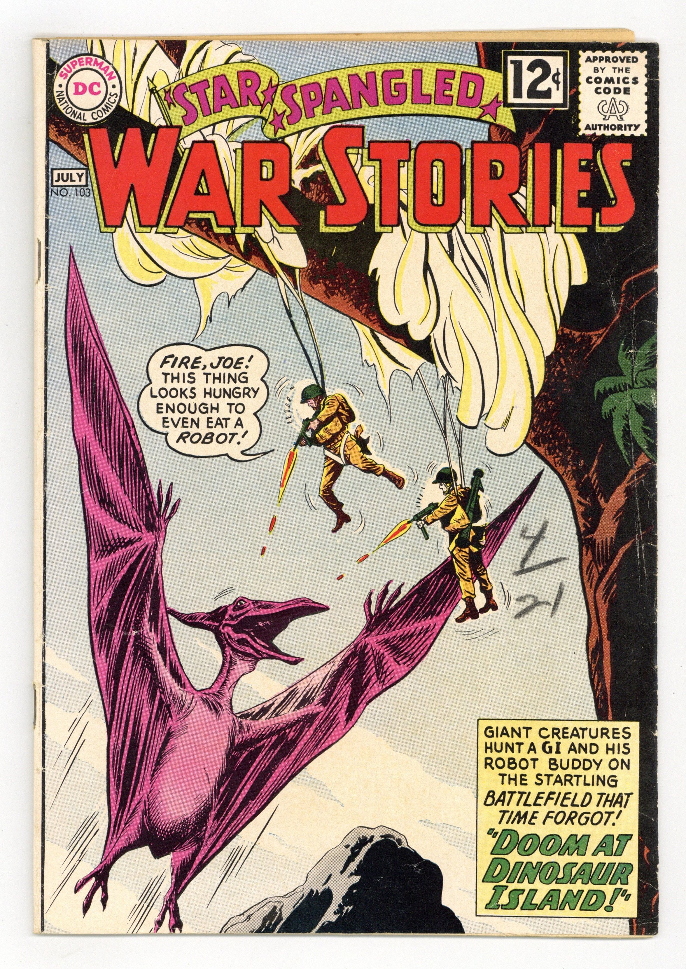 Dinosaur issue. Cover pencils by Ross Andru, inks by Mike Esposito. Stars and Stripes Against Swastikas, art by Jerry Grandenetti. The Ozarks, WWII Battle Story of the 102nd Infantry Division, script and pencils by Morris Waldinger, inks by Tom Nicolisi. 36 Pages, Full Color. Cover price $0.12.