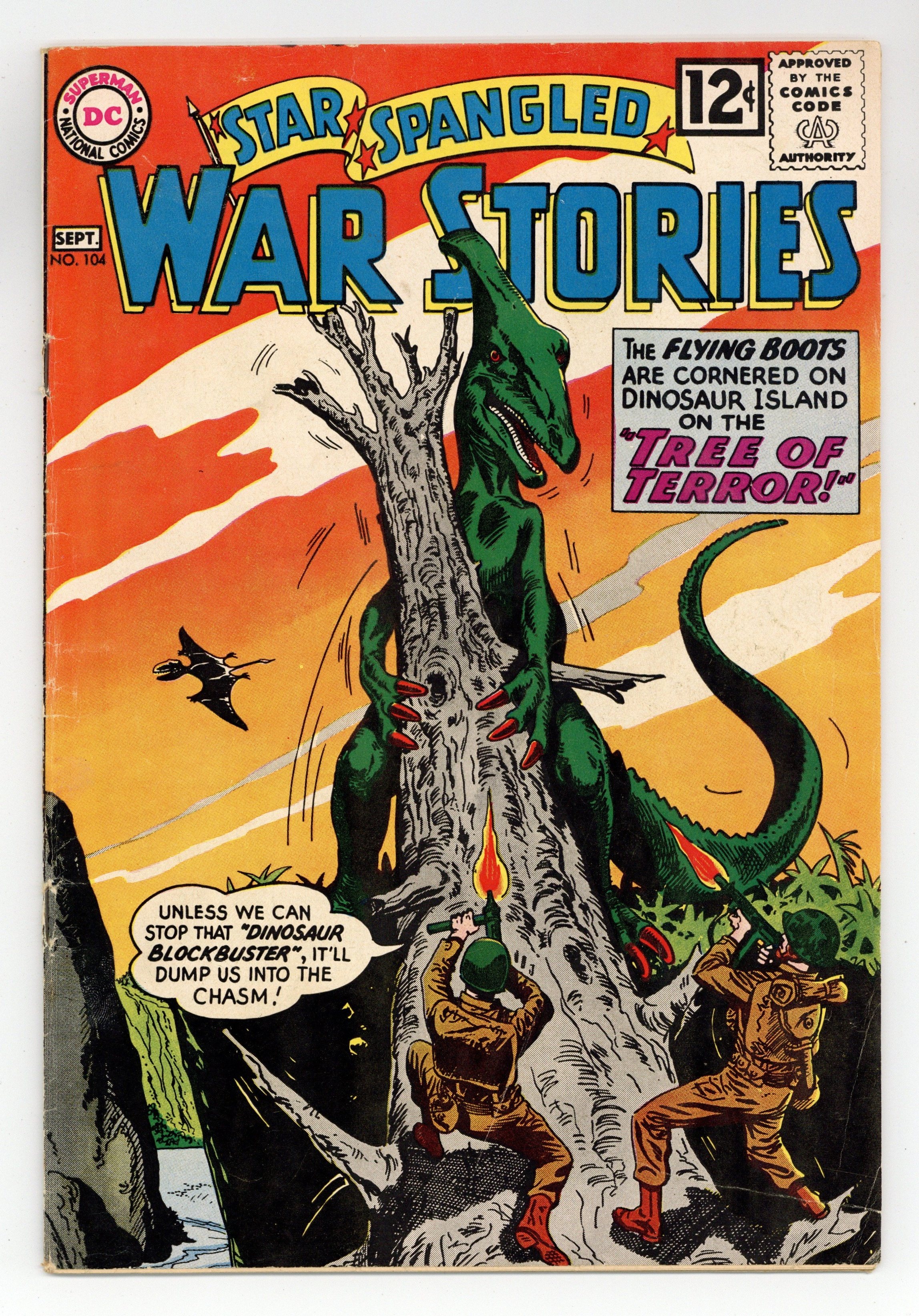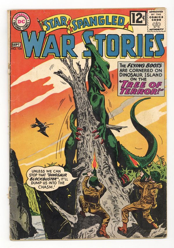Dinosaur issue. Cover pencils by Ross Andru, inks by Mike Esposito. The Tree of Terror featuring The War That Time Forgot with The Flying Boots/Franks, script by Robert Kanigher, pencils by Ross Andru, inks by Mike Esposito. The Silent Tin Can, script by Bob Haney, art by Jack Abel. Sink That Tank, art by Jack Abel. Army Slang filler half-page, script and pencils by Morris Waldinger, inks by Tom Nicolisi. 36 Pages, Full Color. Cover price $0.12.