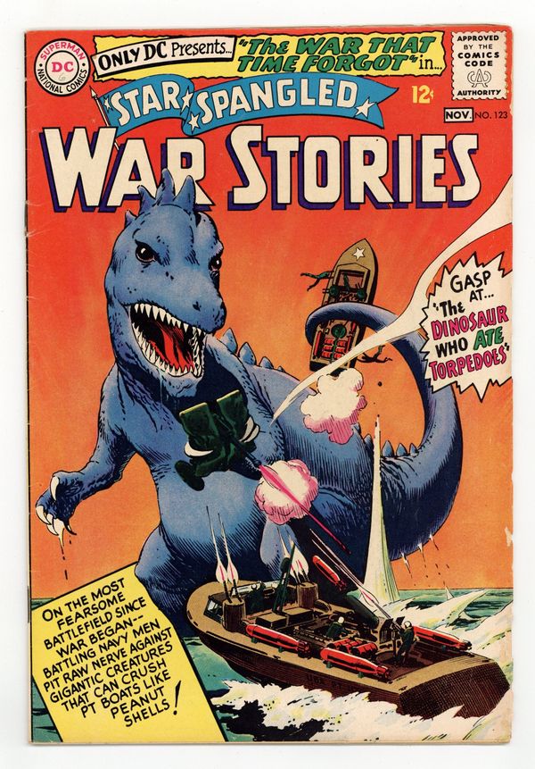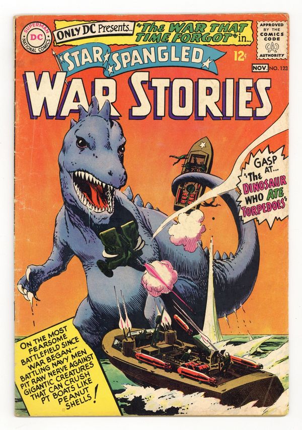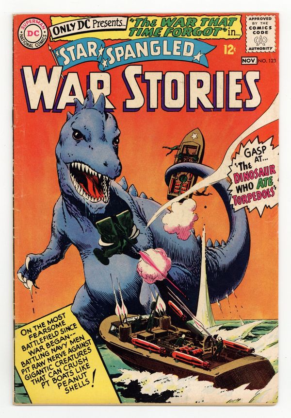 $30.50Cover art by Russ Heath. The Dinosaur Who Ate Torpedoes! featuring The War That Time Forgot, script by Robert Kanigher, art by Gene Colan. Terror in a Bottle! featuring The War That Time Forgot, script by Robert Kanigher, pencils by Ross Andru, inks by Mike Esposito. Shooting Foxhole!, script by Hank Chapman, art by Jack Abel; WWII Infantry Story. Air Force Mottoes filler page, script and pencils by Morris Waldinger, inks by Tom Nicolisi. 36 Pages, Full Color. Cover price $0.12.