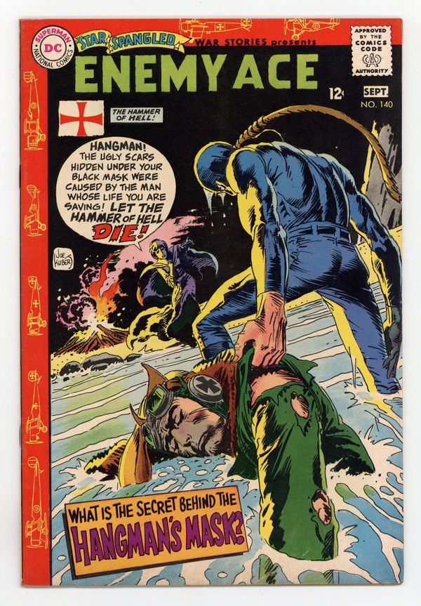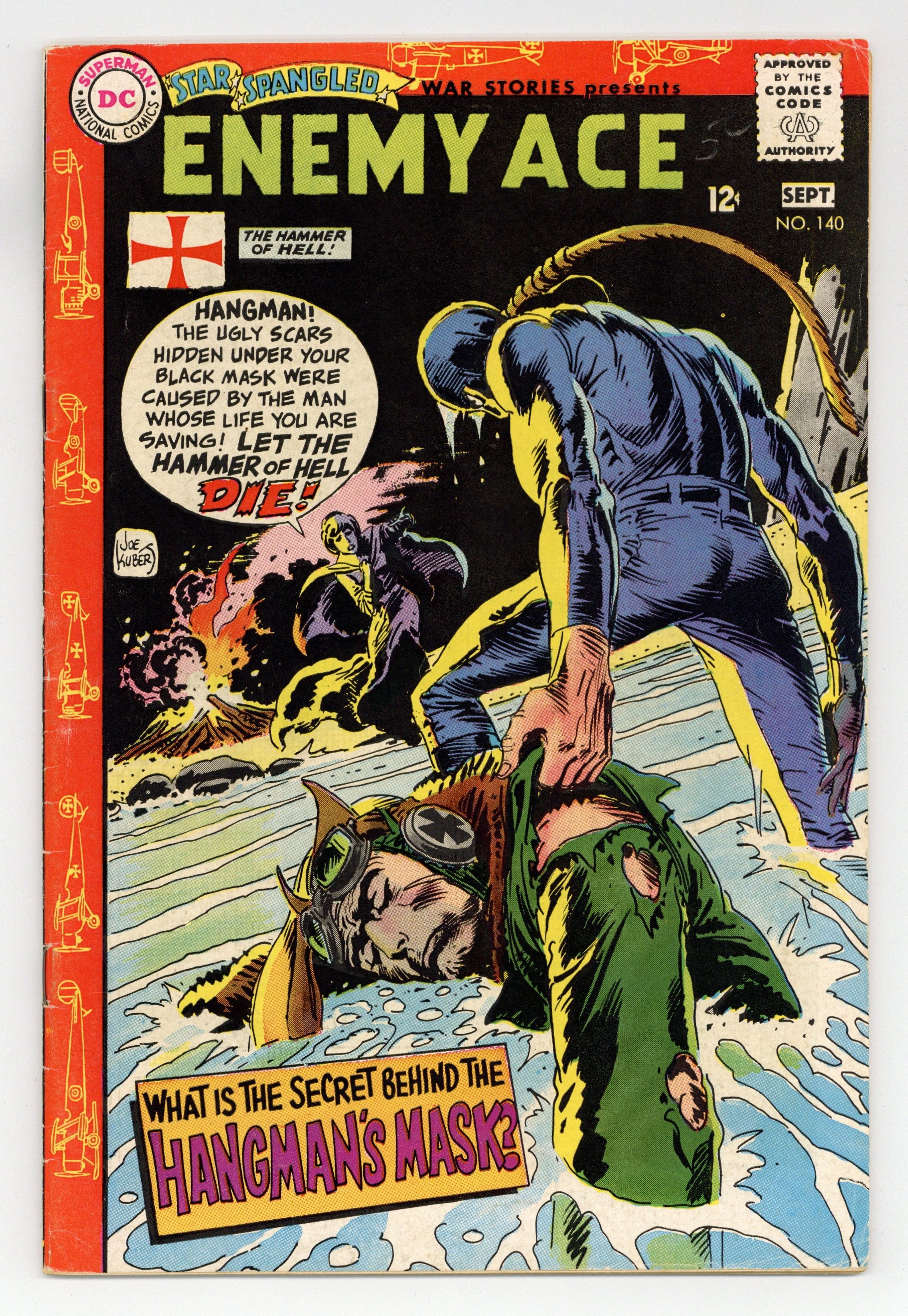 Cover art by Joe Kubert. The Face of the Hangman starring Enemy, script by Robert Kanigher, art by Joe Kubert; When the Enemy Ace crashes behind enemy lines, his wounds are treated by The Hangman and his sister; Just before being sent to a POW camp, von Hammer escapes and returns to his own airfield. Ad for Superman's Pal, Jimmy Olsen #113, pencils by Ross Andru, inks by Mike Esposito. Ad for The Hawk and The Dove #1, art by Steve Ditko. 36 Pages, Full Color. Cover price $0.12.