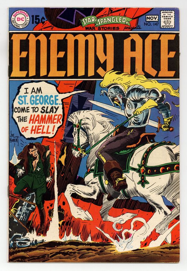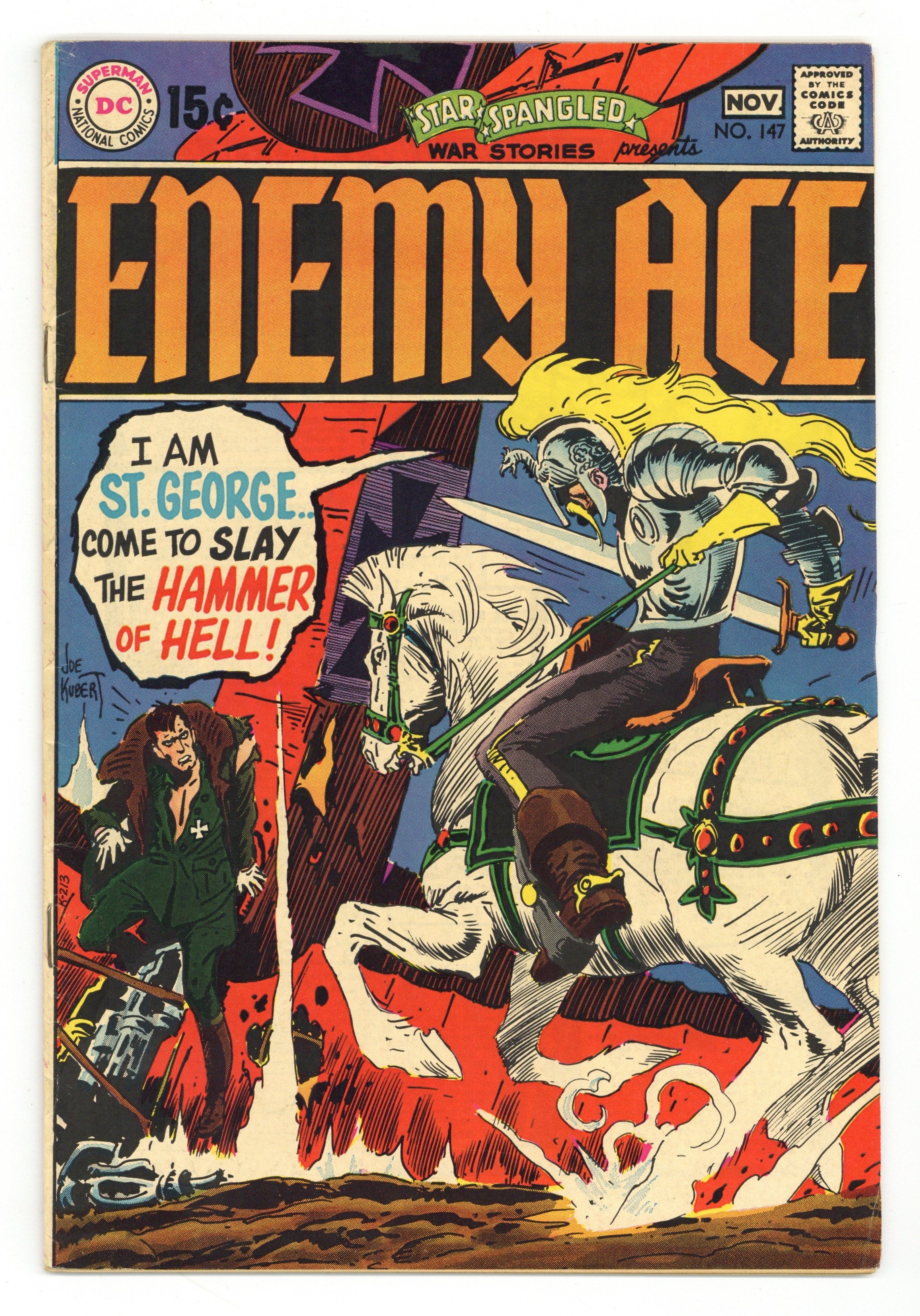 Cover art by Joe Kubert. A Grave in the Sky! starring Enemy Ace, script by Robert Kanigher, art by Joe Kubert; St. George attempts to slay the dragon that terrorizes England... the Enemy Ace! Ad for DC Special #5 [The Secret Lives of Joe Kubert], art by Joe Kubert. Ad for World's Finest Comics #188, pencils by Curt Swan, inks by Murphy Anderson. 36 Pages, Full Color. Cover price $0.15.